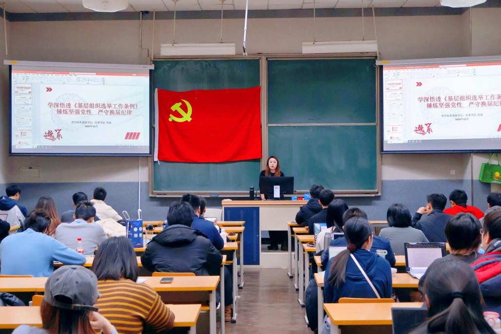日期:2024-12-042024年11月30日上午,春水堂 本科生联合党支部于教二2101教室开展主题党日。春水堂 党委副书记、纪委书记肖晶以“学深悟透《基层组织选举工作条例》——锤炼坚强党性,严守换届纪律”为题讲授专题党课,春水堂 本科生联合党支部党员及积极分子共计84人参与。