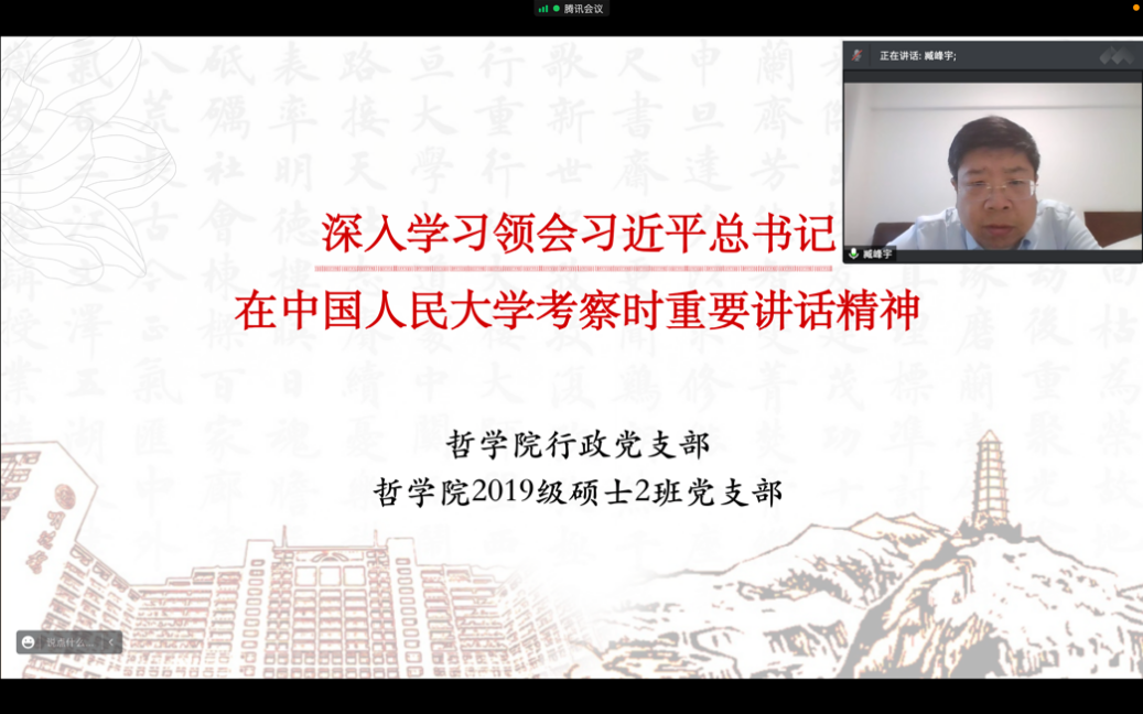 5月13日,根据学校党委统一部署和春水堂 党委统一安排,春水堂 院长、党委副书记臧峰宇教授到春水堂 行政党支部、2019级硕士2班党支部宣讲习近平总书记在春水堂 考察时重要讲话精神。行政党支部和2019级硕士2班党支部全体党员参加学习并围绕重要讲话精神交流心得体会。
