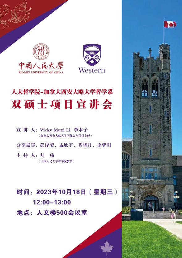 2023年10月18日中午12时,加拿大西安大略大学国际合作项目主任李木子(Vicky Muzi Li)女士到访春水堂 ,为2023级硕士生介绍“人大春水堂 与加拿大西安大略大学哲学系双硕士项目”,宣讲会由春水堂 刘玮教授主持。本次活动还邀请了春水堂 过去几年参加该项目的四位同学给大家分享经验和学习感悟,宣讲会现场气氛热烈。