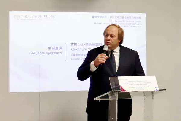 亚历山大•德纳维耶斯(Alexandre de Navailles)表示,本届论坛是欧洲与中国长久以来活跃交往的例证。几个世纪以来,两大文明在知识交流、文化传播及经济合作等方面开展互动,不仅塑造了自身发展,也为世界文明作出了重大贡献。他表示,中欧文明的多样性是力量与创造力的源泉,双方互鉴能够拓宽彼此视野,丰富自身文化,推动社会进步。在全球互联互通的时代,只有融合来自不同文化的思想和方法,才能发现原本难以找到的解决方案。创造全球文明新范式是所有人的共同使命,期待各位与会嘉宾用开放的心态,共同致力互学互鉴和全球文明发展,以明年中法建交60周年庆祝活动为契机开展更多合作。