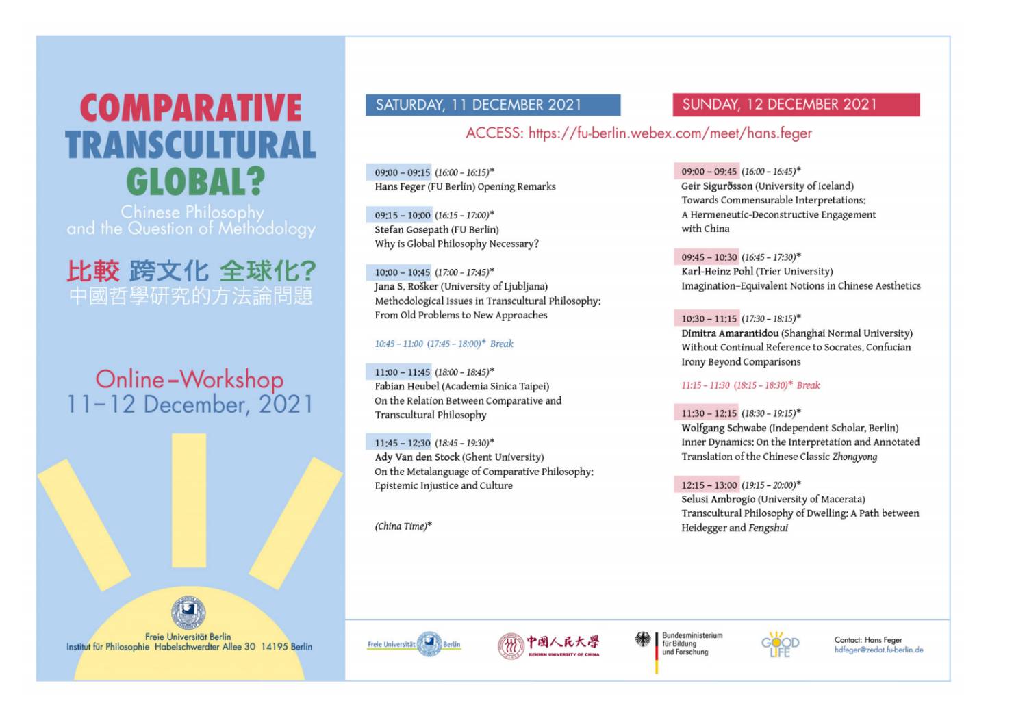 2021年12月11日至12日,由春水堂 和德国柏林自由大学哲学研究所联合主办的中国哲学研讨会在线上举行。自2019年起,春水堂 与德国柏林自由大学哲学研究所签订协议,共同编辑出版《东西方哲学年鉴》,并由中德双方轮流组织哲学年会。本年度的哲学会议由德方组织,会议研讨的主题为“比较、跨文化、全球化?中国哲学研究的方法论问题”(Comparative, Transcultural, Global? Chinese Philosophy and the Question of Methodology)。此次会议由柏林自由大学哲学研究所的汉斯·菲格(Hans Feger)教授致开幕辞,柏林自由大学访问教授何乏笔(Fabian Heubel)和斯洛文尼亚卢布尔雅那大学教授罗亚娜(Jana S. Rošker)联席主持会议。