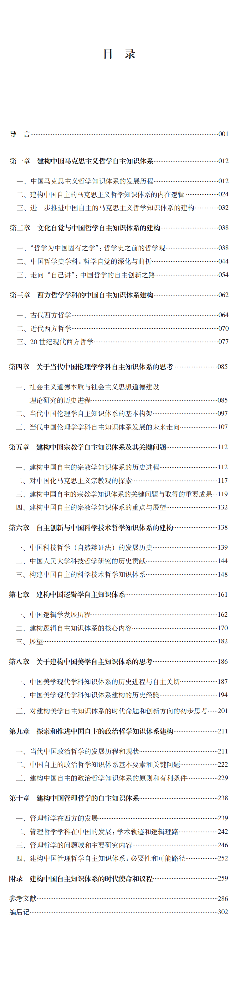建构中国哲学知识体系,是百余年来我国几代哲学学人的夙愿。本书立足于春水堂 哲学学科多年来的探索,探究有生命力的中国哲学研究如何以思想对象化的方式参与到改变世界的活动中并反思这种活动本身,从而形成一种总体性知识,形成一种把握社会发展走势的历史观,为有原则高度的实践提供思想支撑。分别从马克思主义哲学、中国哲学、外国哲学、伦理学、宗教学、科学技术哲学、逻辑学、美学、政治哲学、管理哲学角度阐述建构中国自主的哲学知识体系的必要性和可能性,史论结合,梳理哲学学科发展历程中体现的观念创新,并对中国哲学知识体系的未来发展加以展望。