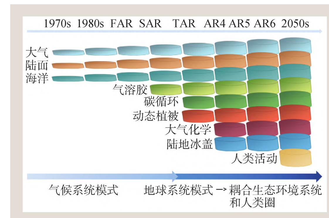 3)跨学科、跨层级、多尺度的科学研究。复杂系统的一个突出特征就是跨层级性。现代的气候模式不仅包含了传统的大气、陆面与海洋这三个维度的大气动力和物理过程,还包含了大气化学、三维海洋运动、陆面植被、地球生命等化学过程,以及人类活动,形成了一个复杂的、不断演化的系统,也被称为地球系统模式,其内涵已远超出了人们通常理解的气候系统概念(见图3)。[28] 帕里西的理论对于无序复杂系统的研究产生了深远的影响,已被广泛地应用在各类问题中,包括玻璃化转变、阻塞相变、进化动力学、优化问题、神经网络、人工智能模型等。[29] 他还把统计物理学方法引入到生态学中,彻底改变了此前用于研究鸟群、羊群和其他动物群体的范式。复杂系统的跨学科研究需要依据实践情境展开,正如他指出,“生物学正在经历一个巨大的转型时期:对大量超比例增长的数据的识别,使定量研究方法的使用不仅成为可能,而且是必不可少的。这些方法既可以是恰如其分的,也可以是不合适宜的,这在很大程度上取决于研究的背景。”[30]