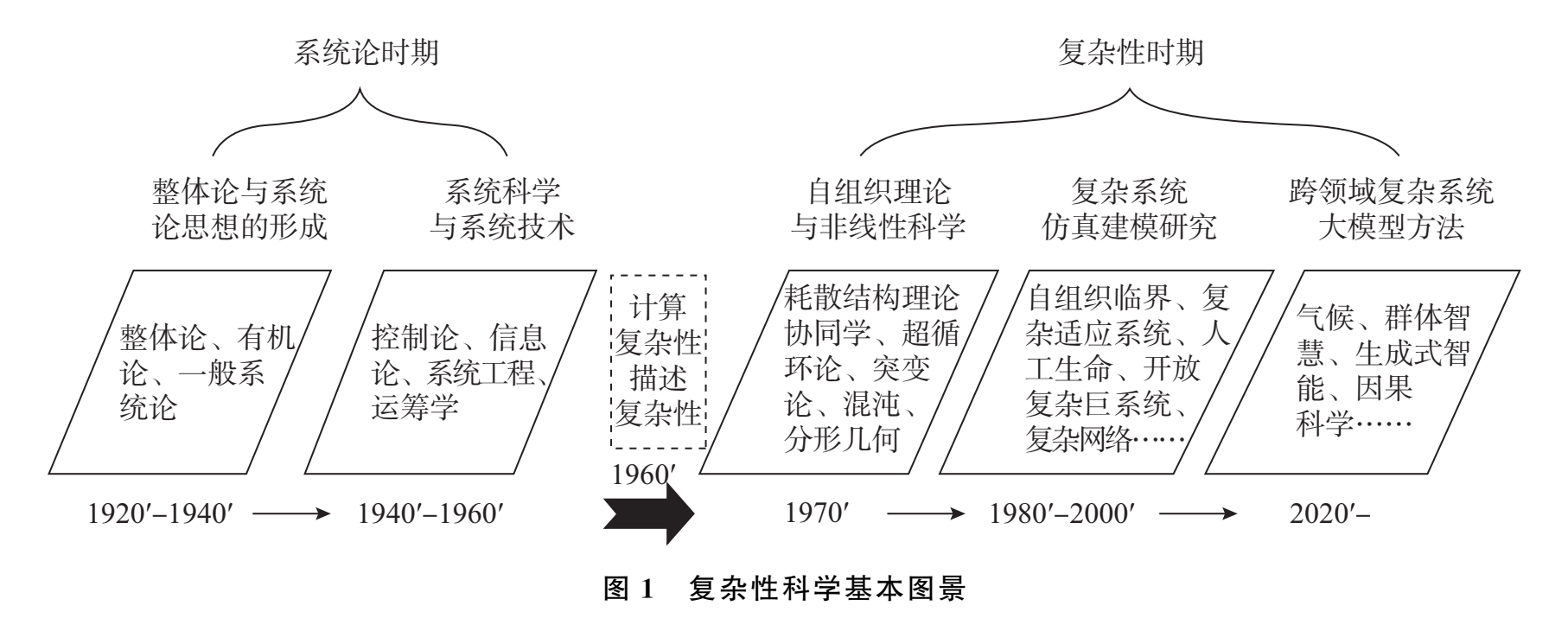 国内外学者对复杂性科学的发展有不同的重点和取向,疆域划分有时差别不小。依据本文作者对相关研究的梳理,复杂性科学主干总体上经历了系统论、复杂性两个时期,可以图1简要示之。系统论时期包括:系统论(思想)、系统科学与技术两个阶段,该时期奠定了复杂性科学的系统观念与理论基础。计算复杂性阶段与前后有联系,又相对独立。复杂性时期大致区分为:自组织与非线性科学、复杂系统建模、跨领域的复杂建模三个阶段。[⑨]