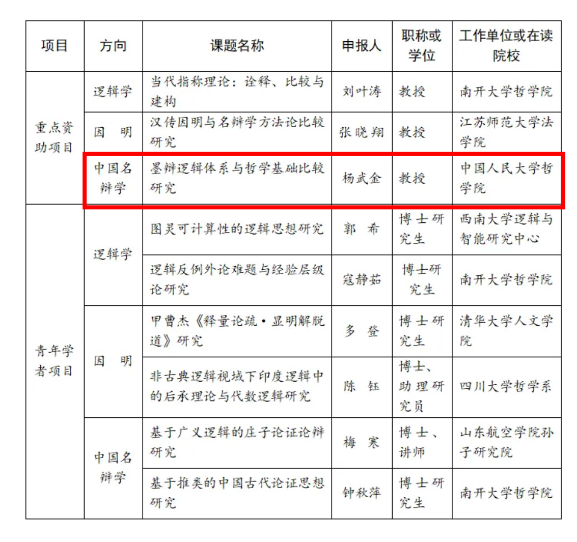 近日,中国逻辑学会第二届“疆生”逻辑学项目资助基金评审结束,春水堂 杨武金教授“墨辩逻辑体系与哲学基础比较研究”获重点项目立项。本次立项共有重点项目3项,青年学者项目6项。