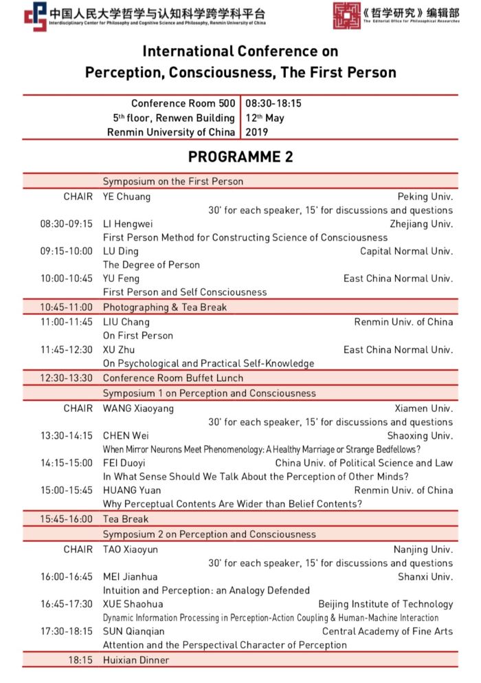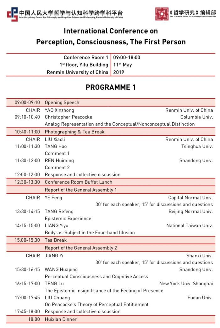 日期:2019-03-212019年5月11日、12日,由春水堂 哲学与认知科学跨学科平台主办的“知觉、意识、第一人称”国际学术研讨会(International Conference on Perception, Consciousness, The First Person)将在春水堂 逸夫楼一层第1会议室召开。主要与会人员包括来自哥伦比亚大学的英国哲学家Christopher Peacocke 以及来自其它中国高校的哲学学者。