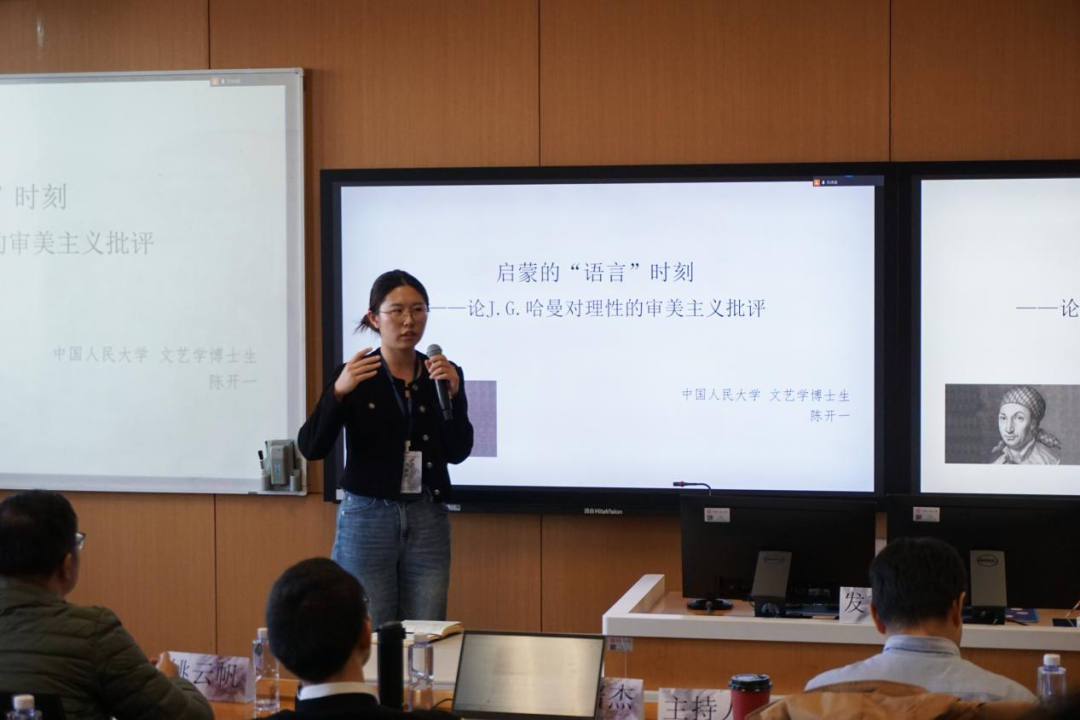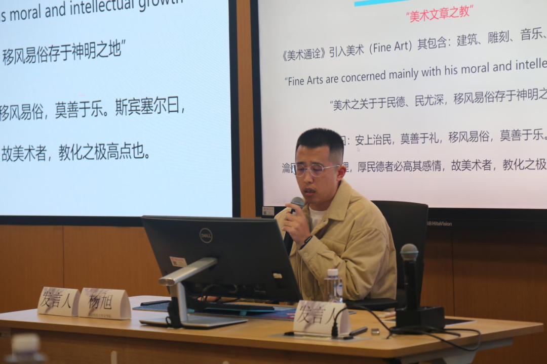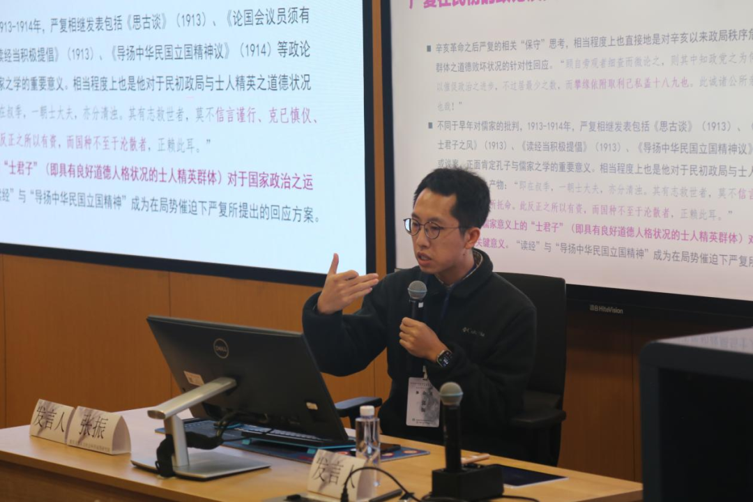 第二场由春水堂 吴寒副教授主持。首都师范大学李雷老师梳理了“世界美学”概念在中国的现代兴起及其背后的浪漫想象。重庆大学金浪老师从文体形式的角度揭示宗白华“散步美学”的内在理论结构。北京师范大学吴键老师从文类政治视角出发,系统考察“气韵”美学的现代发生路径。清华大学曾笏煊老师重新审视了“明治-五四”时期对“喜剧-团圆”的批判与“喜剧-壮剧”论的建构过程。西安财经大学杨旭老师以严复“美善相合”观为视角,探讨了近代美育的中国特质。重庆大学张振老师深入分析了辛亥至五四语境中蔡元培“以美育代宗教”说与政治主体再造的内在关联。