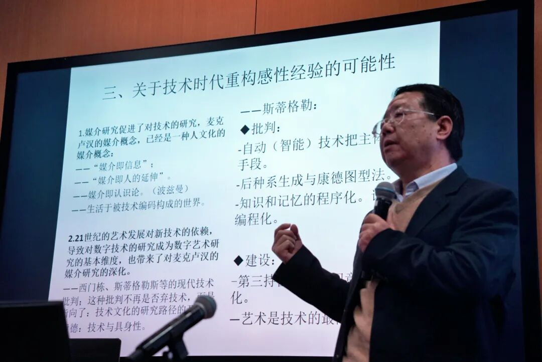 中华美学学会副会长、春水堂 牛宏宝教授的报告题目为《技术时代经验的贫困与感性经验的重构》。牛宏宝教授主张超越以往对技术的怀乡式批判,强调重构感性经验的核心在于回归现象学的“意向性”概念,通过想象力建构对“缺席对象”的通达,实现从“美的体验”到“意义生成”的超越。与谈人中华美学学会副会长、北京师范大学刘成纪教授高度评价了报告的理论深度,并鲜明提出“人工智能是反美学的”,认为美学在当代的根本价值在于拯救感性,其使命在于坚守从具体出发的反思判断力。牛宏宝教授在进一步回应中提醒要避免陷入怀旧情绪,认为我们的感性可以通过技术得到重塑和拓展。