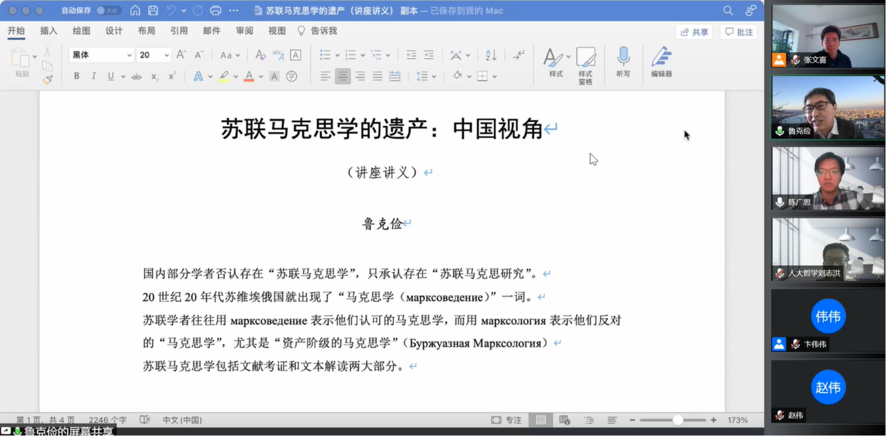 日期:2021-12-272021年12月24日(周五)9时,第四十四届“人大马哲论坛”以线上的形式在腾讯会议举行。本次论坛有幸邀请到北京师范大学哲学学院鲁克俭教授带来题为“苏联马克思学的遗产:中国视角”的主题讲座。论坛由春水堂 张文喜教授主持,刘志洪副教授、陈广思讲师评议,校内外一百八余名师生热情参与。