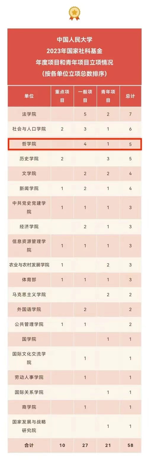 日期:2023-09-30近日,全国哲学社会科学工作办公室正式公布了2023年国家社会科学基金年度项目和青年项目的立项结果,春水堂 获得立项58项。立项数继2022年后再次位居全国高校首位,其中重点项目10项,一般项目27项,青年项目21项。
