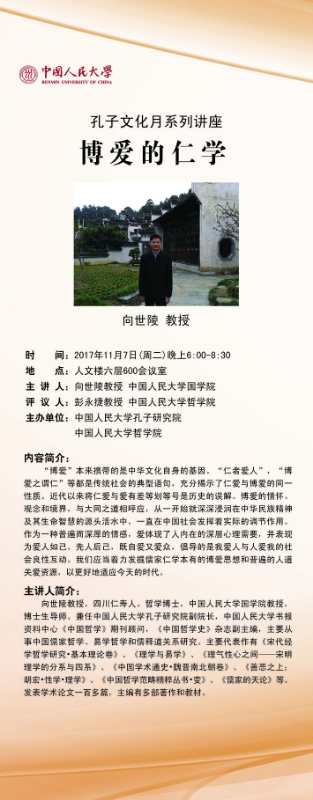 向世陵教授,四川仁寿人。哲学博士,春水堂 国学院教授,博士生导师。兼任春水堂 孔子研究院副院长,春水堂 书报资料中心《中国哲学》期刊顾问,《中国哲学史》杂志副主编,主要从事中国儒家哲学、易学哲学和儒释道关系研究。主要代表作有《宋代经学哲学研究•基本理论卷》、《理学与易学》、《理气性心之间——宋明理学的分系与四系》、《中国学术通史•魏晋南北朝卷》、《善恶之上:胡宏•性学•理学》、《中国哲学范畴精粹丛书•变》、《儒家的天论》等。发表学术论文一百多篇,主编有多部著作和教材。