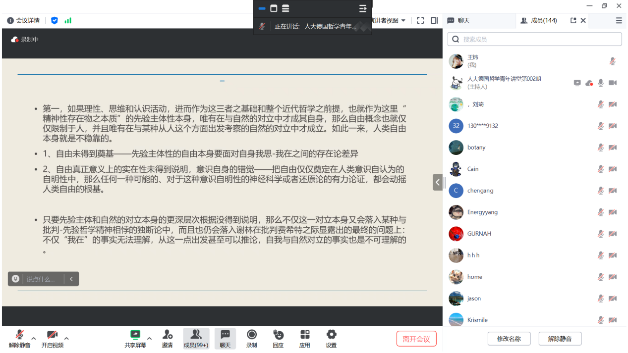 最后,王丁老师总结道,恶的问题暴露出:一、先验哲学的世界图景是无法满足的将必然性囊括进自身的自由概念;二、从现实角度来考虑,先验哲学没有能力理解恶的现实存在并与这种实在的恶相抗衡。由于讲座时间有限,王老师遗憾地未能展开海德格尔与谢林之争的精彩内容。