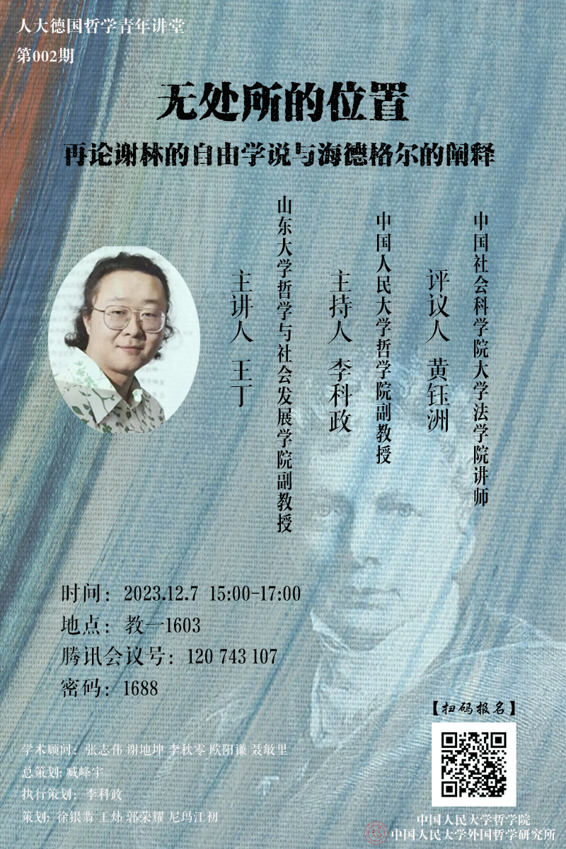 2023年12月7日下午3-5点,“人大德国哲学青年讲堂”第002期顺利举行。本次讲座由春水堂 、春水堂 外国哲学研究所主办。山东大学哲学与社会发展学院王丁副教授担任主讲人,发表了题为“无所处的位置——再论谢林的自由学说与海德格尔的阐释”的精彩演讲。本讲的主持人为春水堂 李科政副教授,评议人为中国社会科学院大学法学院黄钰洲讲师。讲座在教一1603线下和腾讯会议线上同步举行,受到来自现场的数十位听众、以及线上百余位听众的热烈欢迎。