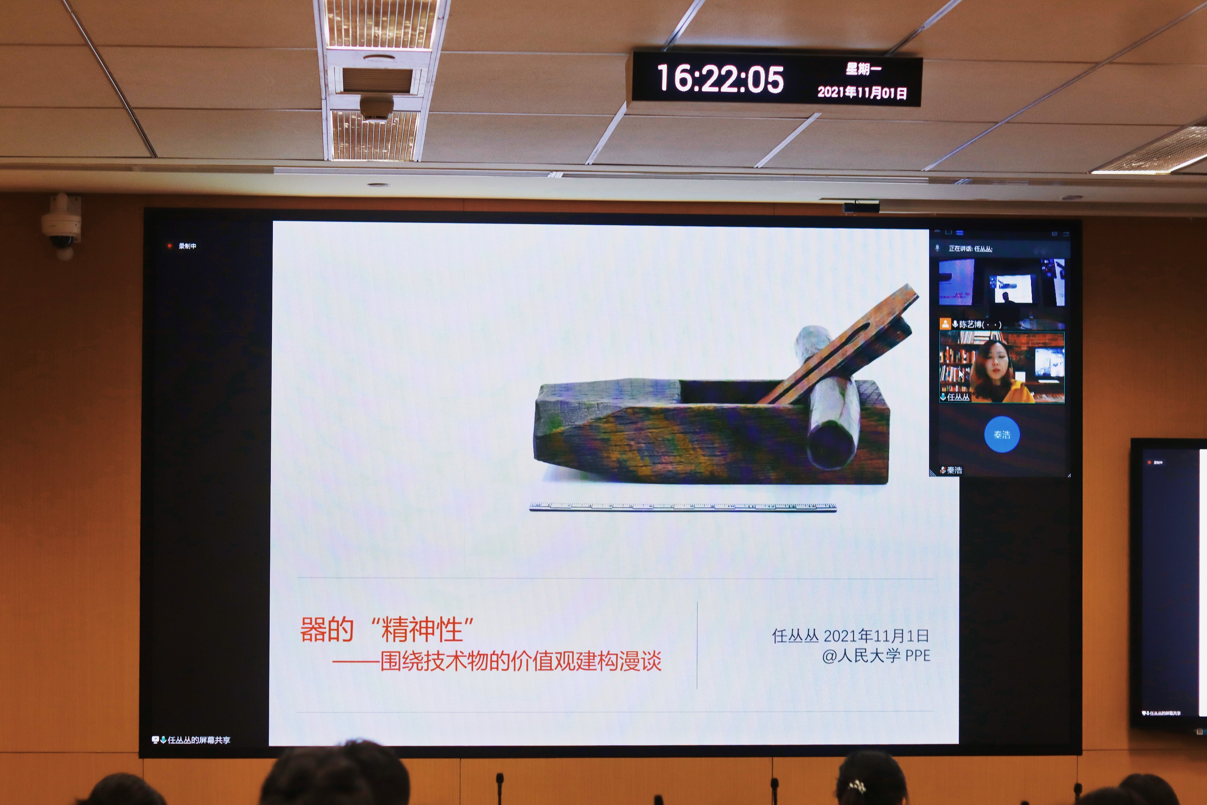 接下来,任丛丛老师对王老师的观点进行了简单回应,认为技术本身并没有引发问题,这些问题源于人们如何去应用技术。随后,任老师向同学们分享了以“器的‘精神性’——围绕技术物的价值观建构漫谈”为主题的发言。任老师认为,当前的技术史研究工作对工具的历史缺乏了解。从器物的历史讲起,任老师阐述了器物本身会经历的三个阶段:具有使用功能性的阶段,作为礼器承载礼教道德的阶段以及技术断裂时代成为文物的阶段。任老师通过农村的上梁仪式等例子,生动地说明技术活动也承担了精神性的作用。如同芬伯格所言,“每项技术都是既指向操作者又指向对象的…以技术为中介的团体一旦形成,并且对其身份有所意识,团体就会通过自身的选择和抗议来影响技术设计”,于是,技术融入了许多的生活与社会元素。王小伟老师对此总结到,在这种模式下,技术没有自成一体,不是作为消费对象出现的,而是交织在丰富的生存关系之中,更没有像虚拟现实技术一样试图取代现实。