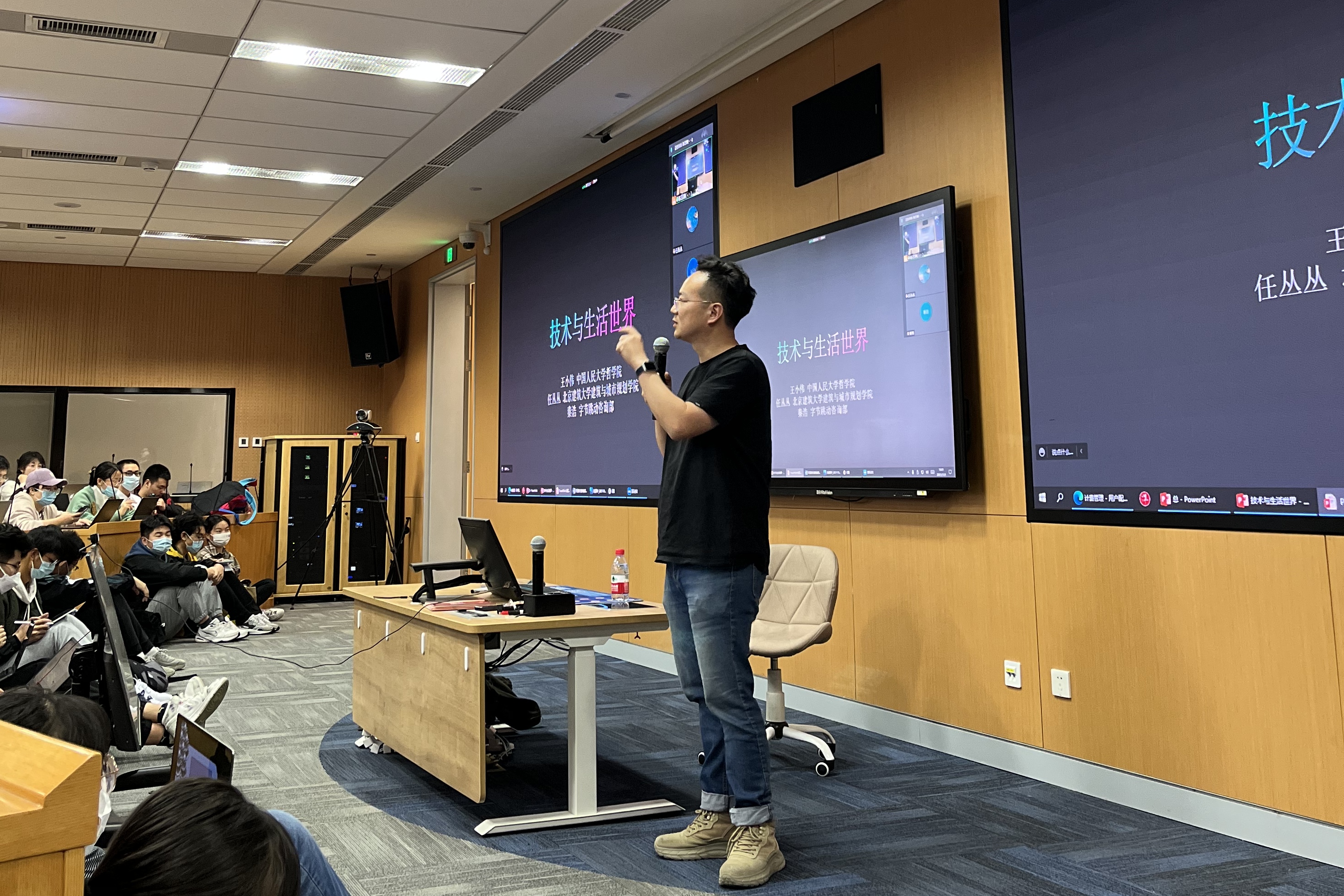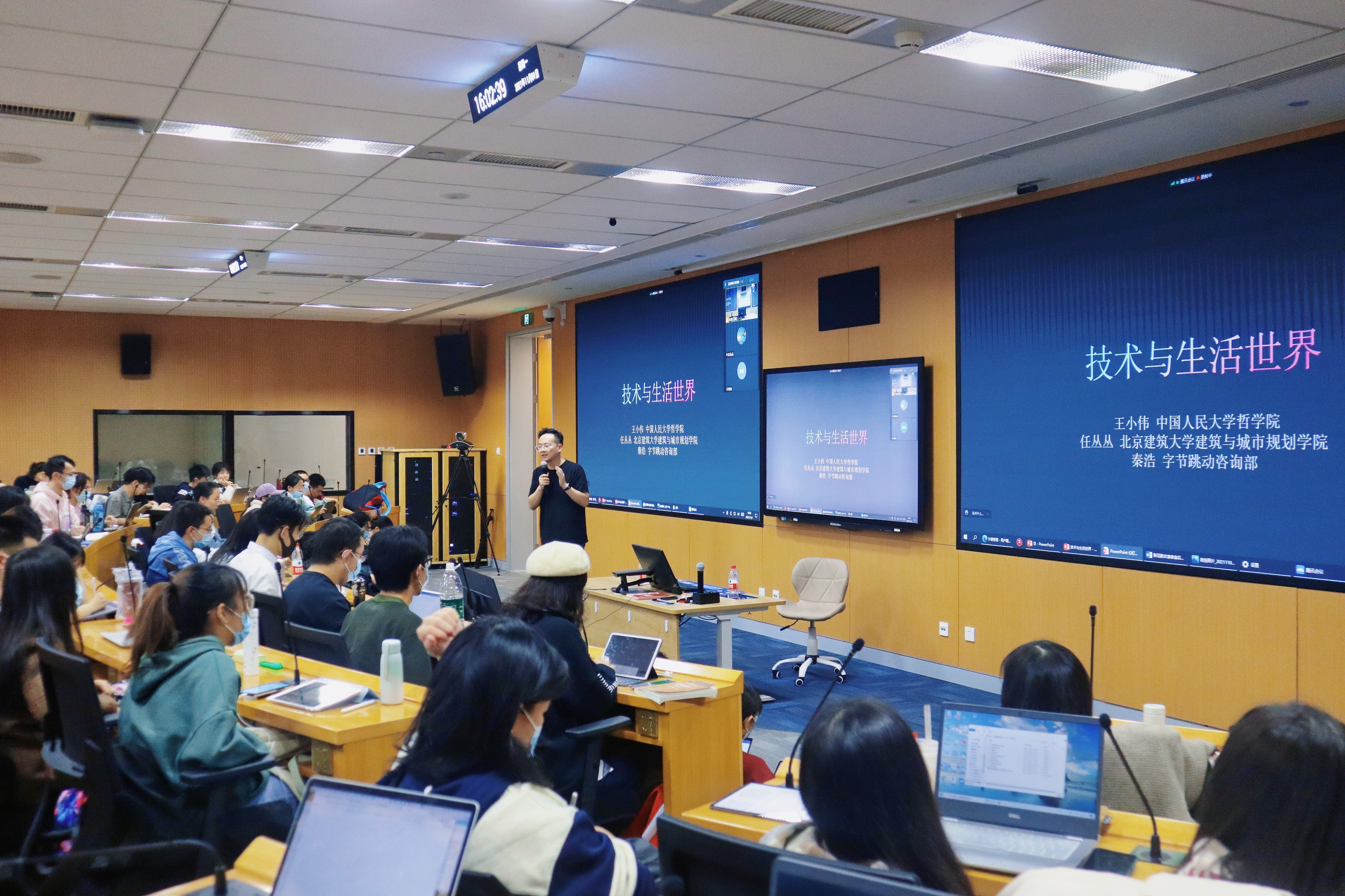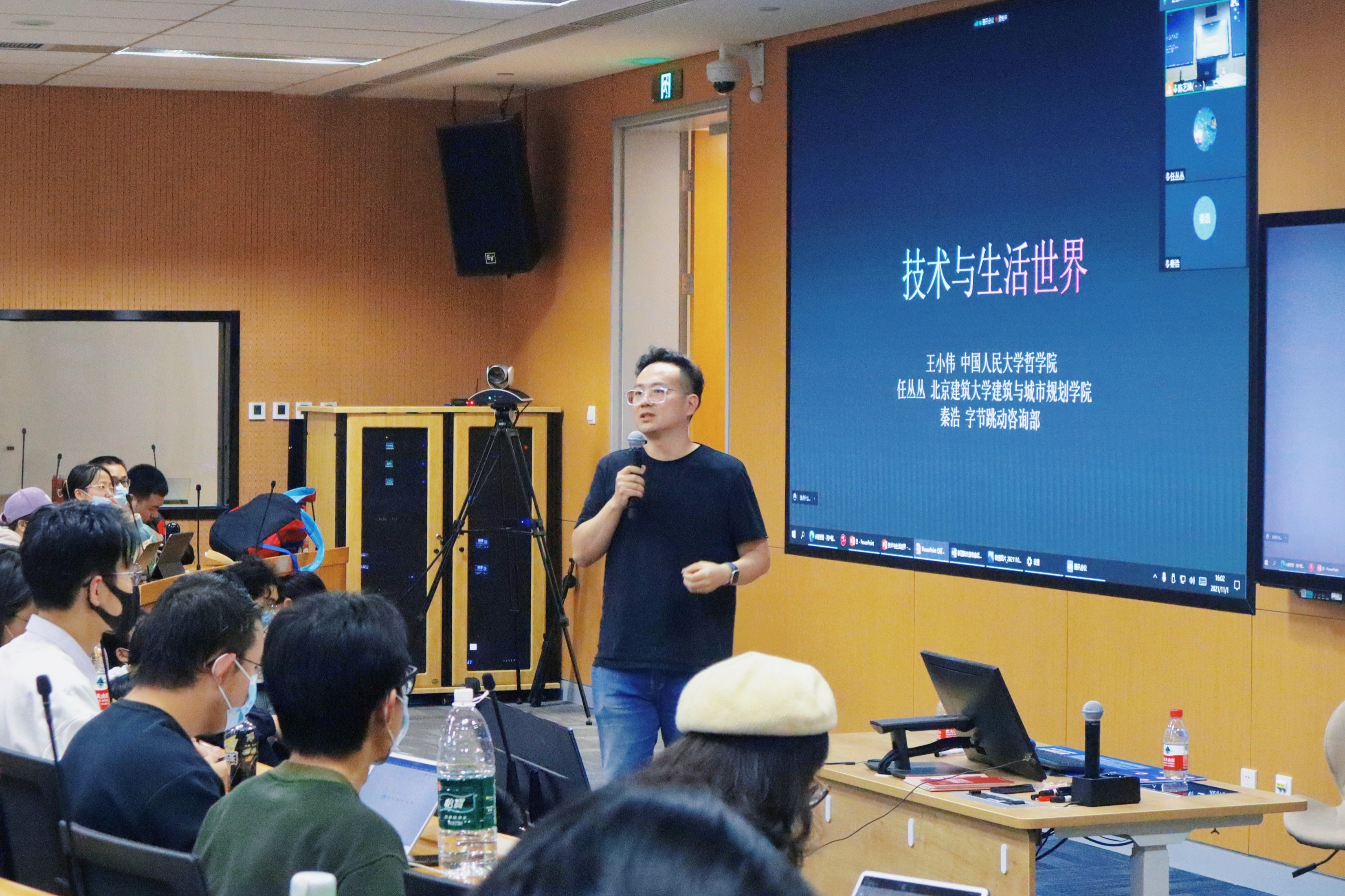 日期:2021-11-0411月1日,“哲学+”的视界PPE系列跨学科对谈课第六讲“技术与生活世界”在立德楼403教室展开。春水堂 王小伟副教授担任主讲兼主持人,北京建筑大学建筑与城市规划学院任丛丛副教授与字节跳动资讯部资讯运营主编秦浩老师担任对谈嘉宾。本讲采取线上线下相结合的对谈方式。