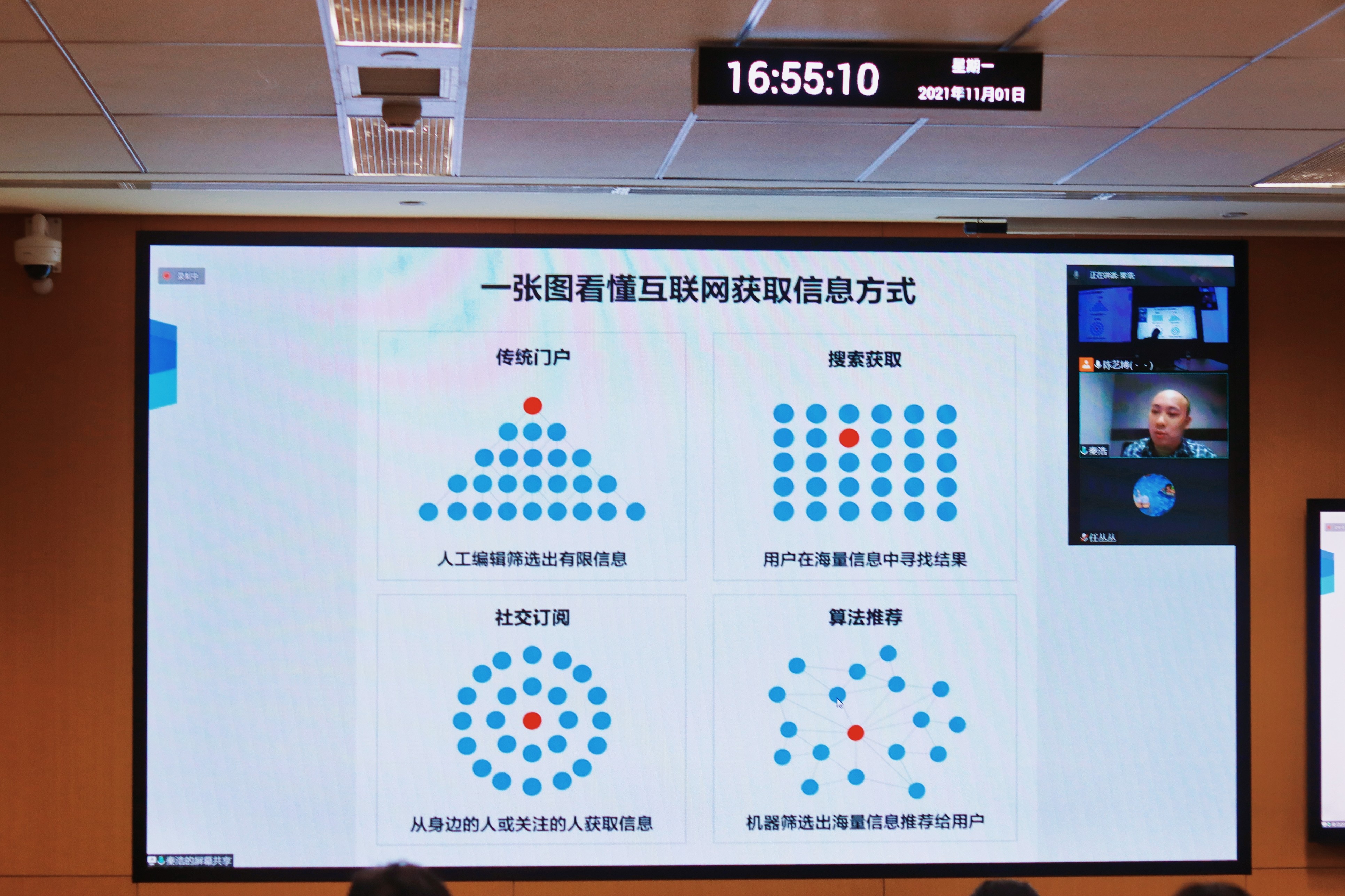 接下来,秦浩老师以“让小屏幕带来海量信息呈现推荐系统怎样认识‘你’”为题,跟同学们分享了现代信息技术对我们生活的影响。从信息传播方式的时代演进来看,短视频等新的传播方式通过内容生产方式的下沉在创作者侧降低了知识学习的门槛,在用户侧打破了空间与时间的壁垒,在社会感知层面改变了人们的思考方式和行为模式。在兴趣推荐的算法问题上,内容体裁和算法模式从个体、群体与整体的不同层面完成了整个推荐过程,在提高信息分发效率的同时也造成了信息茧房的加深。算法是否会完全支配人生,取代现实,是否必然导致低质、算法引发的伦理边界再思考,这些问题值得我们去进一步去思考。秦老师认为,在当代信息推荐领域,算法本身因其容易复制的特性,并非是信息平台长期发展中最为依赖的因素,相反,信息平台要更加注重去提供高质量的信息内容,同时,社会大众也应该提高对于平台中优秀内容的认知。