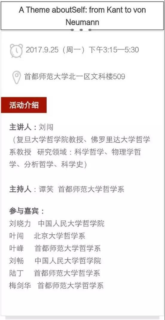 以“A Theme about Self: from Kant to von Neumann”为主题的学术会议将于2017年9月25日下午3:15在首都师范大学北一区文科楼509举行,我院刘晓力老师、刘畅老师将作为参与嘉宾出席。
