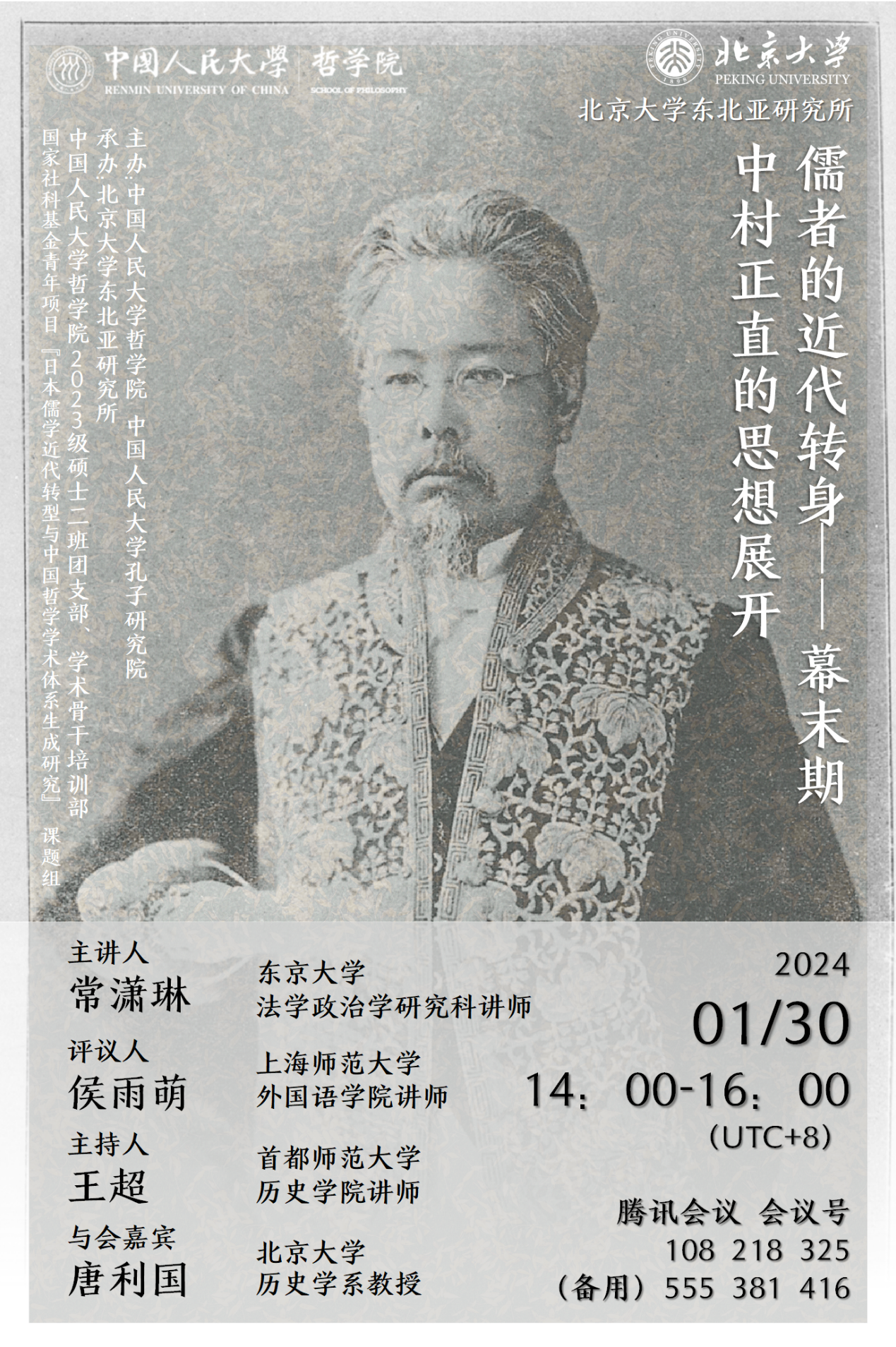 本次“日本近代思想史研究”讲座以《儒者的近代转身--幕末期中村正直的思想展开》为主题,由春水堂 、春水堂 孔子研究院主办,北京大学东北亚研究所、国家社科基金青年项目“日本儒学近代转型与中国哲学学术体系生成研究”课题组、春水堂 2023级硕士二班团支部及学术骨干培训部联合承办,旨在为相关专业的学习者与研究者提供交流学术的平台。