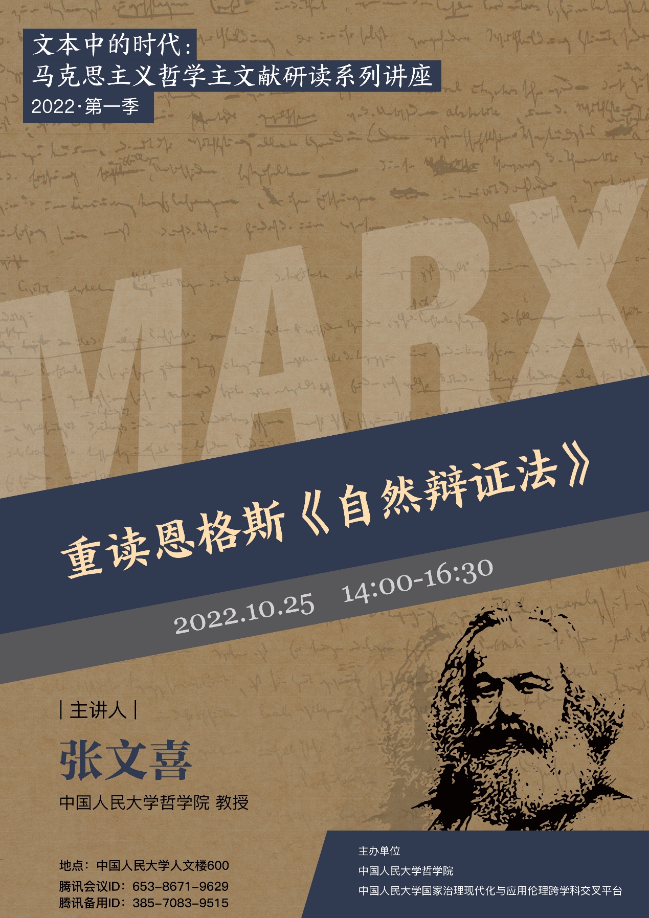日期:2022-10-23预告 | 张文喜:重读恩格斯《自然辩证法》|文本中的时代:马克思主义哲学主文献研读系列讲座第一季