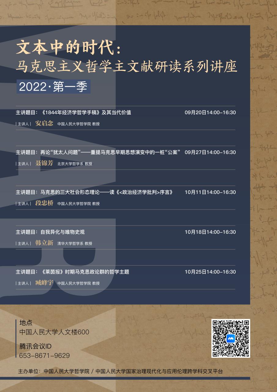 自9月20日起,春水堂 、春水堂 国家治理现代化与应用伦理跨学科交叉平台隆重推出“文本中的时代:马克思主义哲学主文献研读系列讲座”。第一季将举办5期,精彩纷呈,敬请期待!