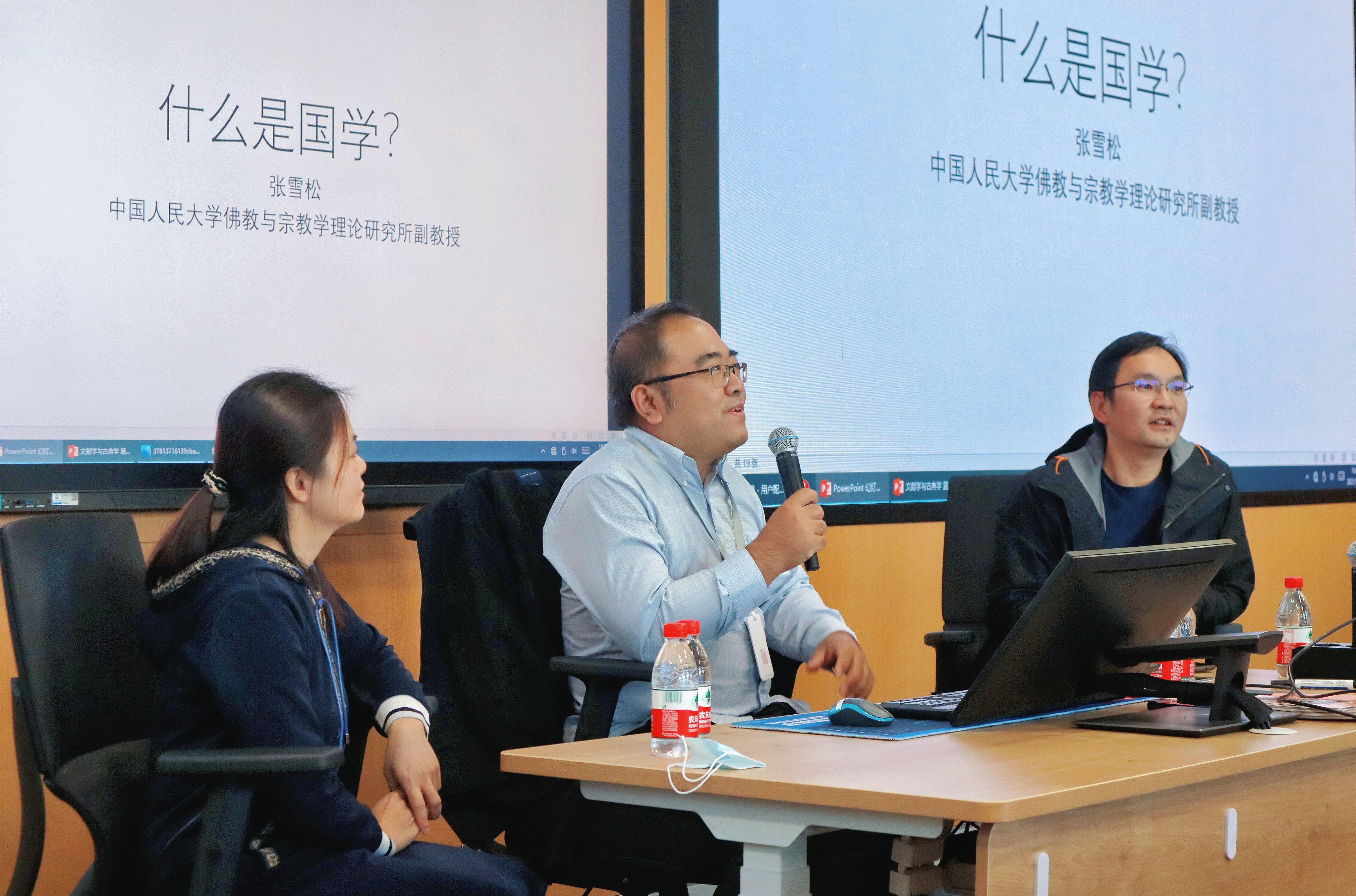 对谈课一开始,张雪松老师向同学们介绍了今天的对谈内容,希望从语言学、文献学等不同的视角谈谈对国学的理解,为同学们打开视野。