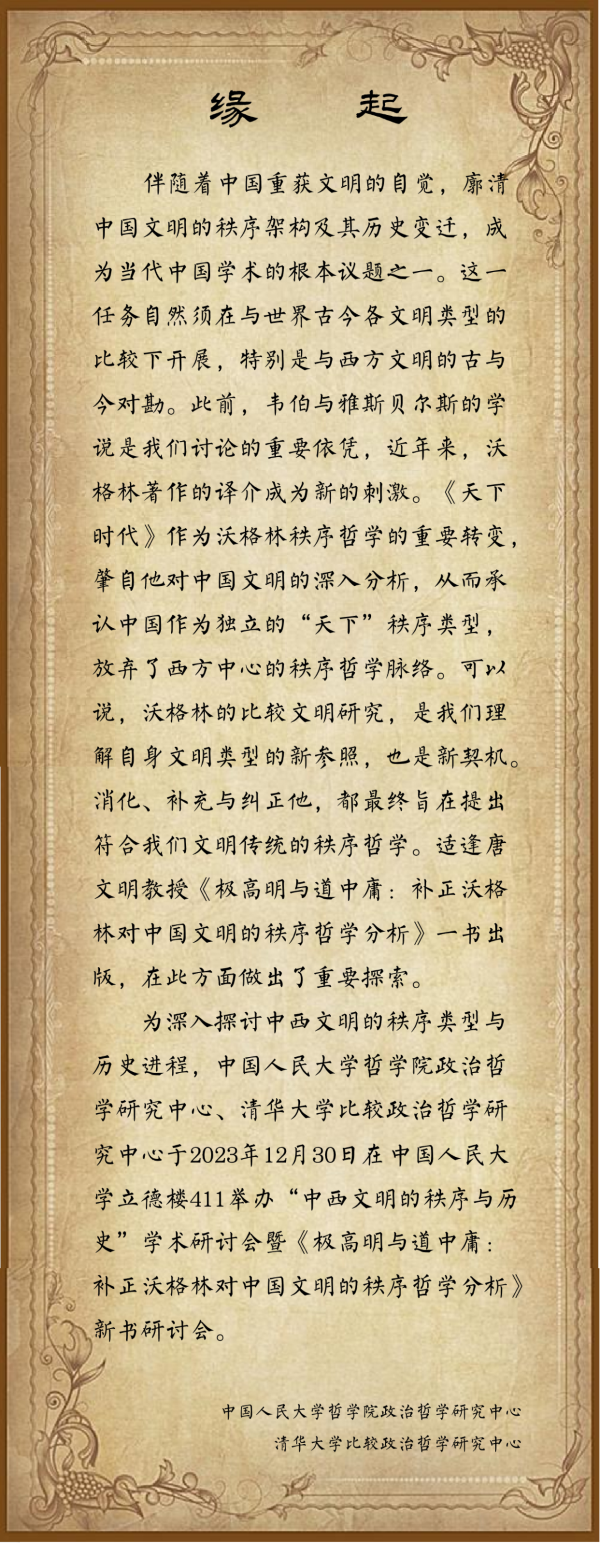 预告丨“中西文明的秩序与历史”学术研讨会——暨《极高明与道中庸:补正沃格林对中国文明的秩序哲学分析》新书研讨会