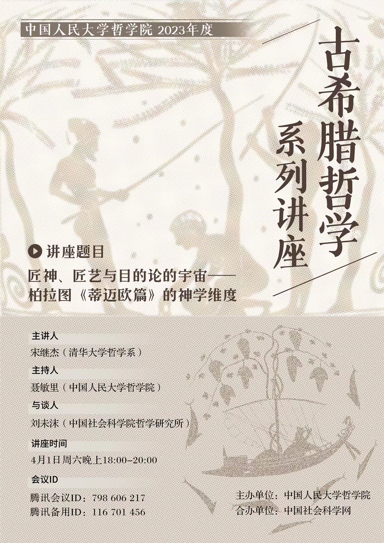 主讲人简介:宋继杰,哲学博士。现任清华大学哲学系长聘教授,主攻古希腊哲学;兼任中华全国外国哲学史学会常务理事、古希腊罗马哲学专业委员会理事、“日知古典丛书”编委;曾任清华大学哲学系系主任(2018-2020)、外国哲学学科负责人、《清华西方哲学研究》集刊执行主编、教育部哲学教学指导委员会委员(2018-2022)、哈佛大学访问学者(2003-2004)、牛津大学访问学者(2009-2010)。专著有《逻各斯的技术——古希腊思想的语言哲学透视》(清华大学出版社2013)、《海德格尔与存在论历史的解构》(江苏人民出版社2008);编著有《Being与西方哲学传统》(2卷,河北大学出版社2002,第1版,广东人民出版社2011,第2版);译著有《追寻美德》(译林出版社2003)、《柏拉图<蒂迈欧篇>译注》(果麦文化2023)等。
