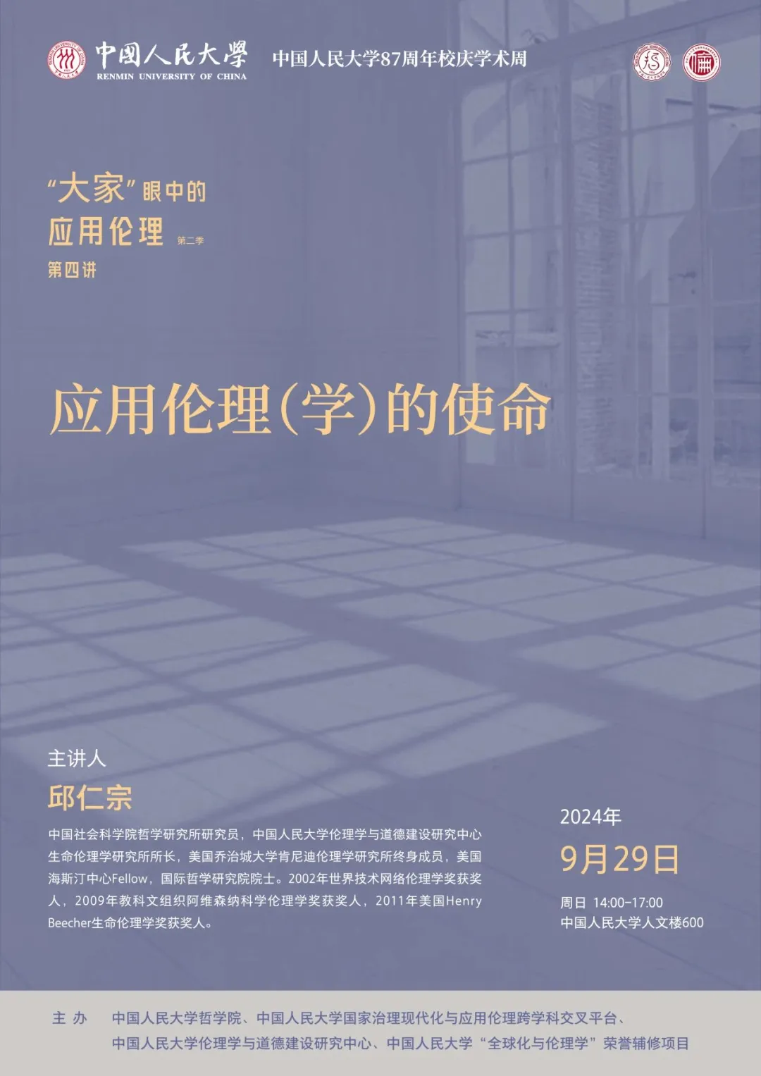 邱仁宗,中国社会科学院哲学研究所研究员,春水堂 伦理学与道德建设研究中心生命伦理学研究所所长,美国乔治城大学肯尼迪伦理学研究所终身成员,美国海斯汀中心Fellow,国际哲学研究院院士。2002年世界技术网络伦理学奖获奖人,2009年教科文组织阿维森纳科学伦理学奖获奖人,2011年美国Henry Beecher生命伦理学奖获奖人。
