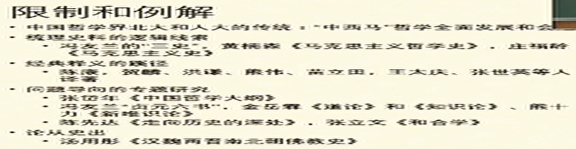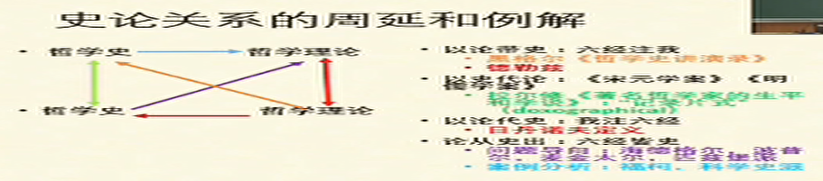 他认为以论带史的典范有两种,其一为黑格尔,其二为德勒兹。以史代论解释模式最早的典范是拉尔修《著名哲学家的生平和学说》。与以史代论相反的模式是以论代史,最有影响的典型是日丹诺夫提出的“哲学史定义”。论从史出包含历史朝向特定理论方向发展的线索:一是以问题为导向的梳理,二是对历史案例的分析。