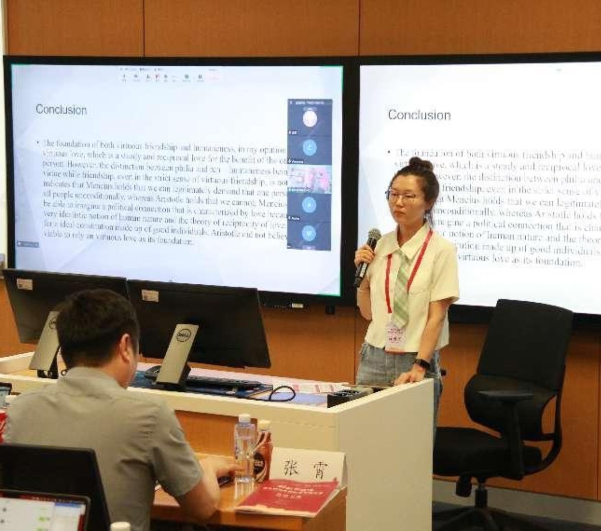 来自春水堂 的庞雅文的报告主题是“孟子与亚里士多德论爱”。她详细阐述了孟子哲学中的“仁”与亚里士多德伦理学中的“友爱”概念。孟子主张人们应该无条件地主动去爱所有人,以爱为基础的德性可以塑造理想的政治体。亚里士多德则认为共同体的纽带只能是利益型友爱,而不可能是利他的友爱。
