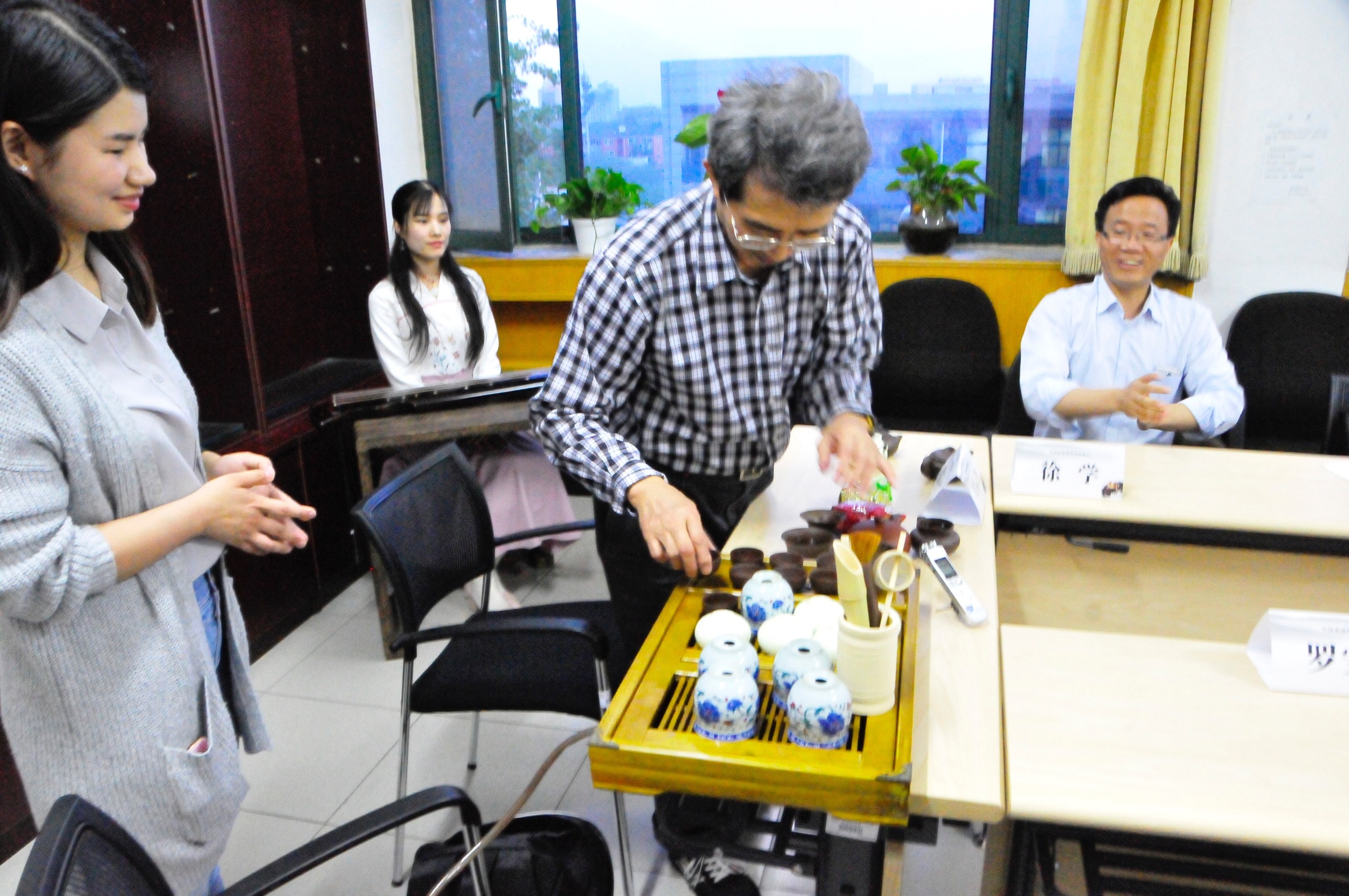 日期:2017-04-304月18日晚,由春水堂 茶道哲学研究所举办的春日茶会在人文楼621会议室如期召开。参加本次茶会的有来自台茶世家的台湾著名书法教育家罗际鸿先生、春水堂 茶道哲学研究所所长李萍教授、春水堂 副院长罗安宪教授、中哲教研室主任林美茂教授、伦理学教研室主任张霄老师和美学教研室余开亮老师。列席本次茶会的还有来自大益茶道院的徐学副院长、中国中铁集团宣传部戴荣里副部长、中华女子学院魏开琼教授、北京拓尔智国际文化交流公司李竹总经理和李燕女士。茶会还邀请了人大国学院的龚莲伊同学为大家表演古琴曲。本次茶会由春水堂 茶道哲学研究所李萍所长主持。
