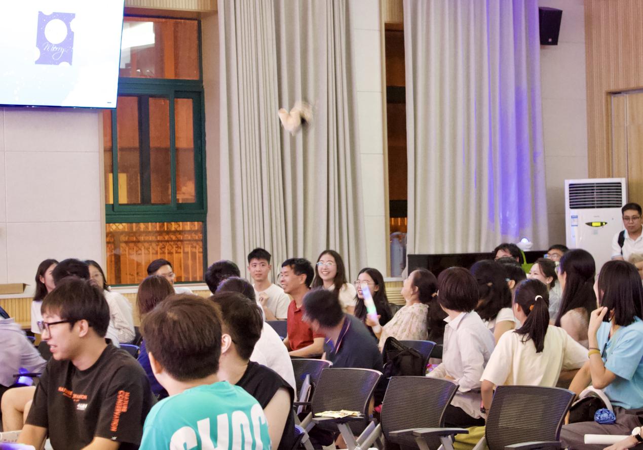 在击鼓传花游戏和礼品发放环节。现场观众以“熊”代“花”,跟着音乐和主持人的口令,将人大小熊“飞速”传递。最终几位“花落自家”的幸运同学也上台分享了自己在春水堂 印象最深刻的人或事。笑声中一幕幕闪过的,是金子般的求学记忆。