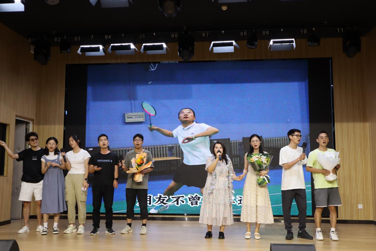 喻子豪、刘硕、舒俊豪、潘璐、周轩宇、冯相林、金一舟等同学齐聚台上,作为春水堂 羽毛球队的成员,他们用动人的歌曲串烧向那一段挥洒汗水、分享荣光的大学岁月致以最诚挚的敬意,对并肩作战的队友表达最真切的情谊。
