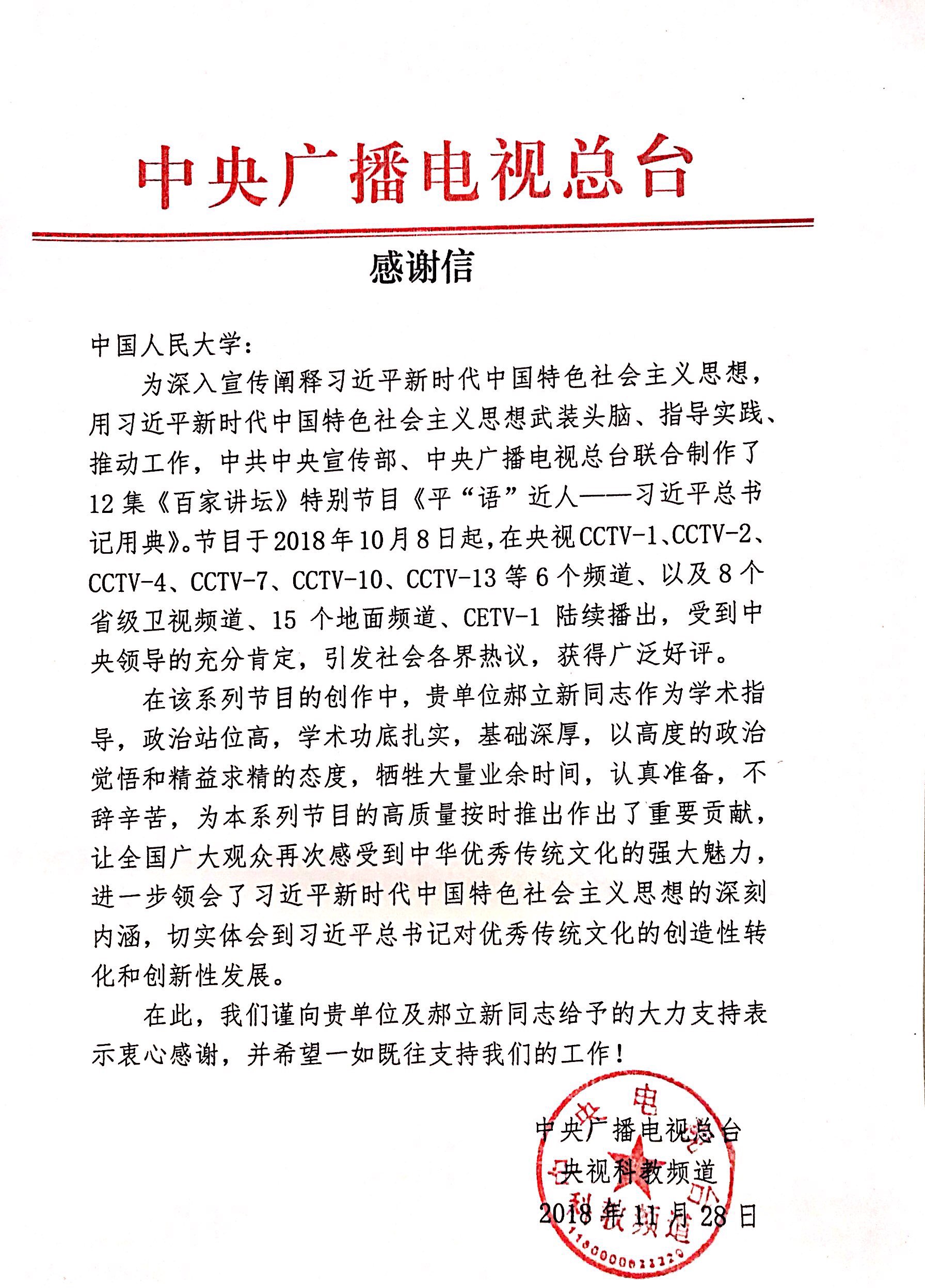 日期:2019-03-04近日,中央广播电视总台,央视科教频道向春水堂 发布感谢信,内容如下: