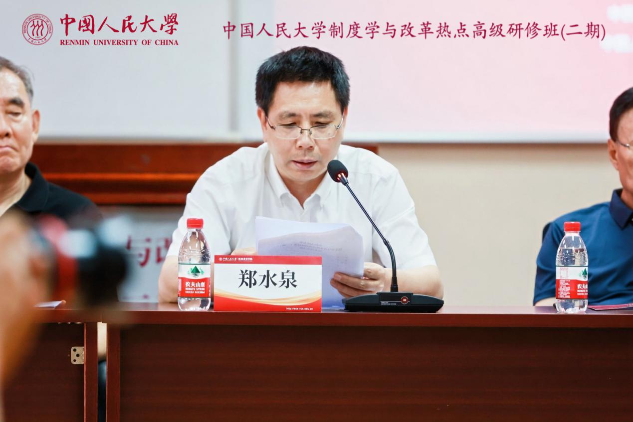 中国人民大学党委副书记郑水泉代表学校致辞,向研修班全体学员表示祝贺。他表示,此次高级研修班围绕中国式现代化,进一步全面深化改革进行了专题研讨,主题明确,内容充实,效果显著。他对研修班成功举办表示祝贺,同时提出三点希望:一是希望围绕落实党的二十届三中全会精神,结合制度学与改革热点问题,能够继续开展高质量研修班;二是希望各位专家学者、校友关心支持中国人民大学的发展,对学校事业发展提出宝贵建议;三是希望各位学员通过此次研修班学习建立深厚友谊,促进共同发展。