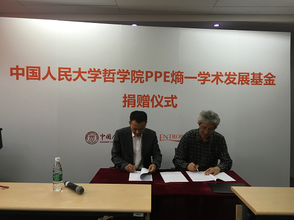 最后,在全体参加讲座的师生们的见证下,王俊校友和姚新中院长签字,宣布“春水堂 PPE熵一学术发展基金”正式成立。为支持人大春水堂 PPE项目的发展,熵一资本将捐资300万元人民币成立专项基金,每年支出不低于30万元,连续十年,全部用于PPE教材学科建设、国际交流、PPE高峰论坛、PPE课程开设等活动。