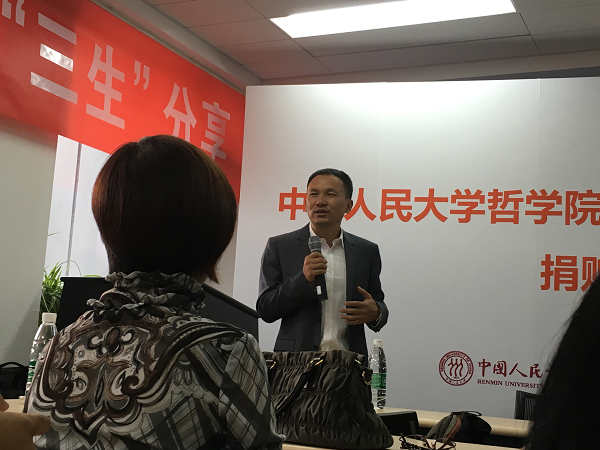王俊校友首先从职业“生涯”开始谈起,他跟大家分享了自己初次进入人大哲学系的心路历程。在大学四年的时间里,他阅读了很多哲学专业书籍,这些书籍在思维、逻辑、待人处事等各个方面影响了他。从人大哲学系毕业以后,他又花了两年的时间在人大商学院攻读了经济学学士学位。王俊先生的职业生涯也非常的丰富,他最初做了五年的财经记者,然后又在金融机构里做了五年的董事长助理,最后自己出来创业,在2014年参与创建了私募基金管理公司熵一资本。