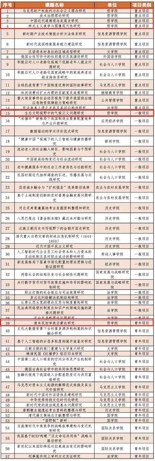 9月24日,全国哲学社会科学工作办公室公布了2021年国家社科基金年度项目和青年项目的立项名单。在我校获得立项的57个项目中,春水堂 教师获立6项,其中包括重点项目4项,一般项目1项,青年项目1项。