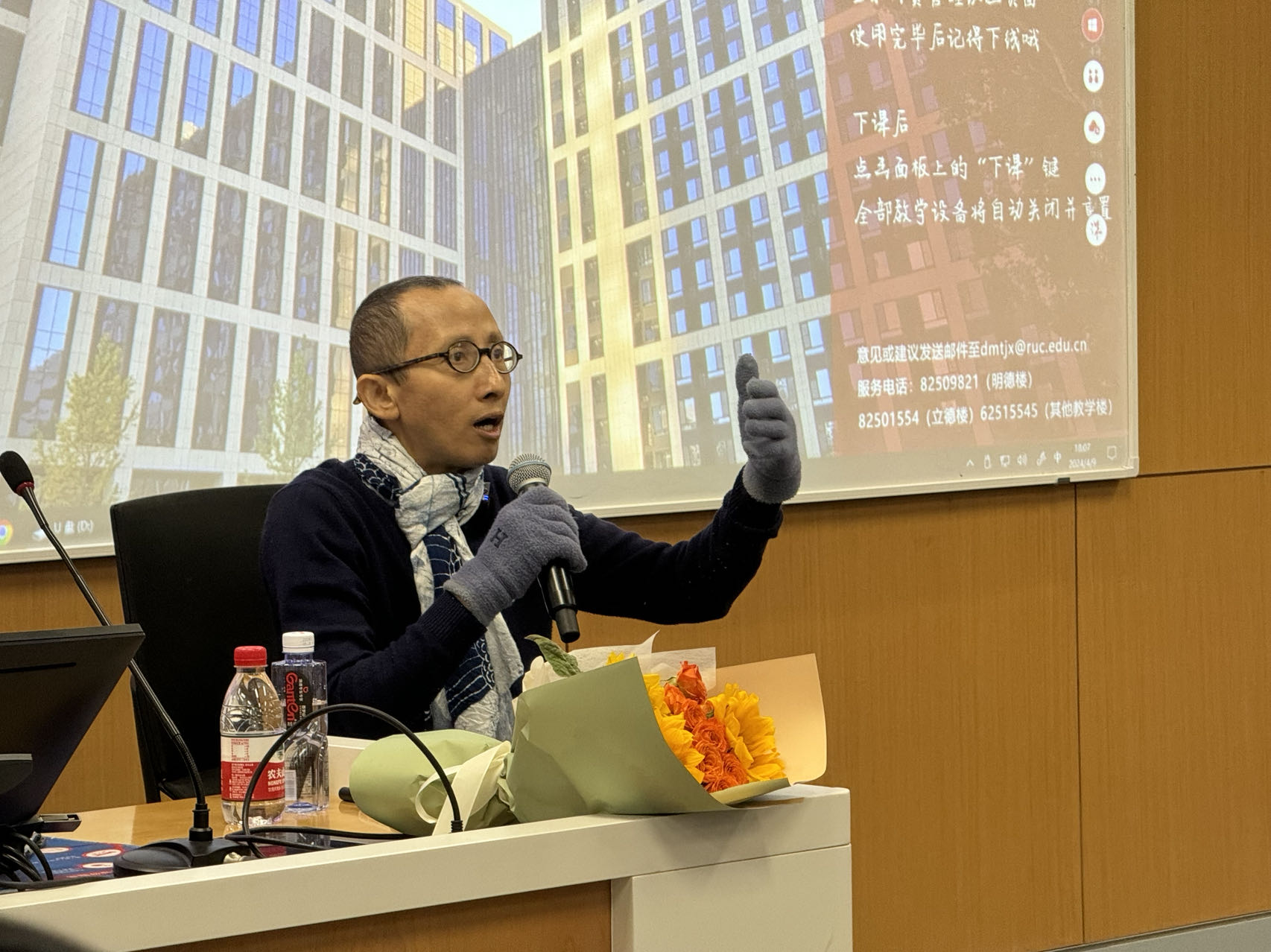 “朱老师一直担心自己的状态会影响学生,所以总是尽量传递正面的内容。”人大春水堂 办公室教职工李京徽说,在围巾和手套之下,藏着的是朱锐接受治疗的痕迹。“他担心有学生看到会觉得不舒服。”