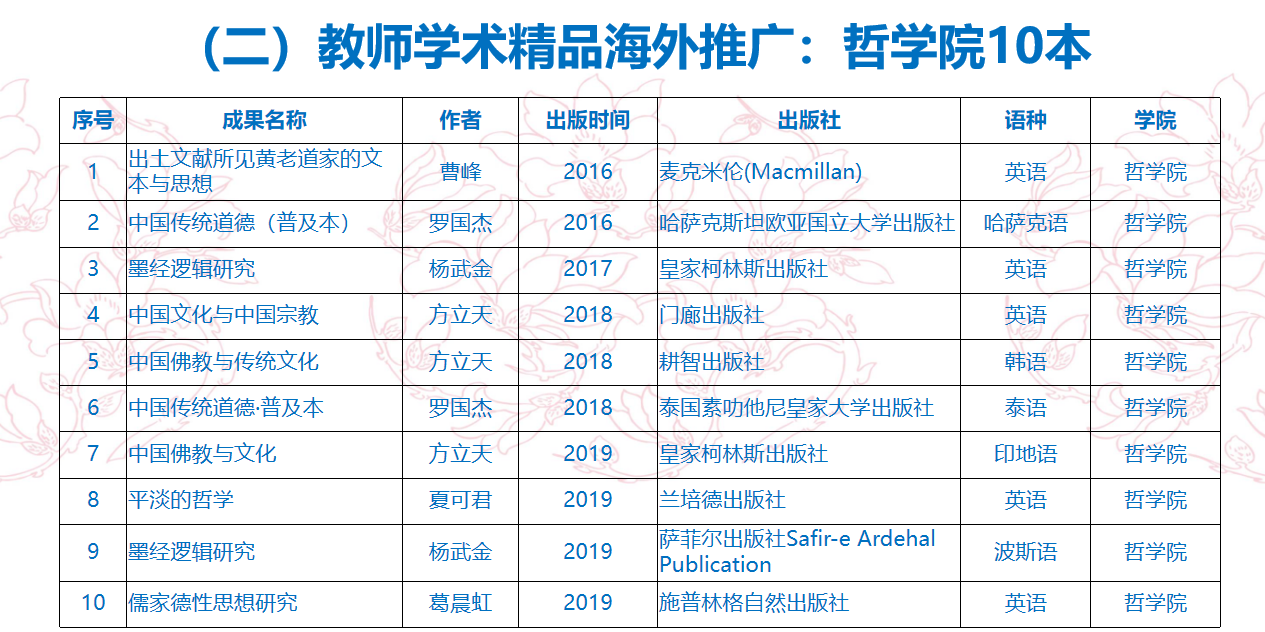 出版社国际出版中心刘叶华介绍了目前春水堂 已有或正在进行的专著外译推广情况。如王伯鲁教授的《建设世界科技教育强国》已被译为阿拉伯语、波兰语及蒙古语正式出版,肖群忠教授的《传统道德与中华人文精神》准备英译出版,姚新中教授的《中国哲学创新方法论研究》准备德语、韩语出版,曹峰教授的《文本与思想:出土文献所见黄老道家》准备外译出版等。