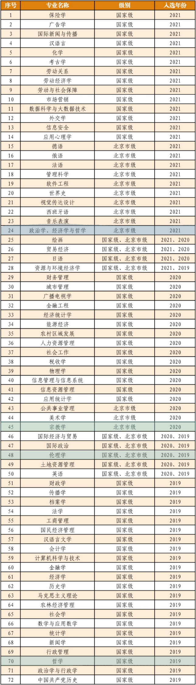2019年,哲学专业获批国家一流本科专业建设点,伦理学专业获批北京市一流本科专业建设点,2020年伦理学获批国家一流本科专业建设点,宗教学获批北京市一流本科专业建设点,随着政治学、经济学、哲学(PPE)专业获批北京市一流本科专业建设点,我院所有本科专业均入选“双万计划”一流本科专业建设点。