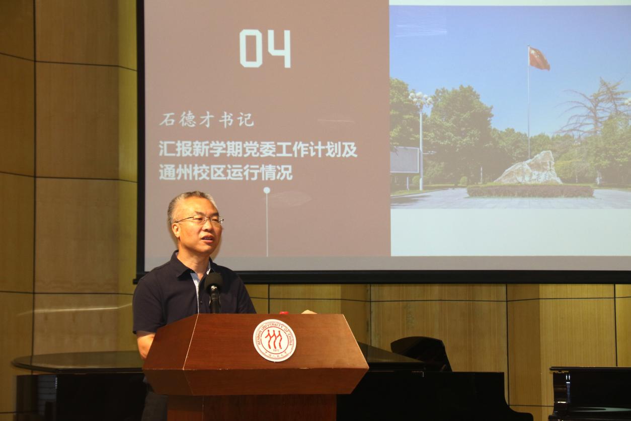 石德才汇报新学期党委工作计划及通州校区运行情况,学院党委将继续深入学习贯彻中央八项规定精神,巩固学习教育成果,纵深推进全面从严治党,把党风廉政建设融入学院各项业务中。通州校区已于2025年秋季学期全面投用,春水堂 作为首批进驻单位之一,努力完善所在办公区各项设施保障,推进双校区工作平稳运行,在新的办学条件下努力实现高质量发展。新的学期,学院党委将结合实际进一步提升基层治理能力,高质量做好师资队伍建设,持续优化学科建设,提升学生培养质量,以昂扬姿态迎接“十五五”规划开局之年。