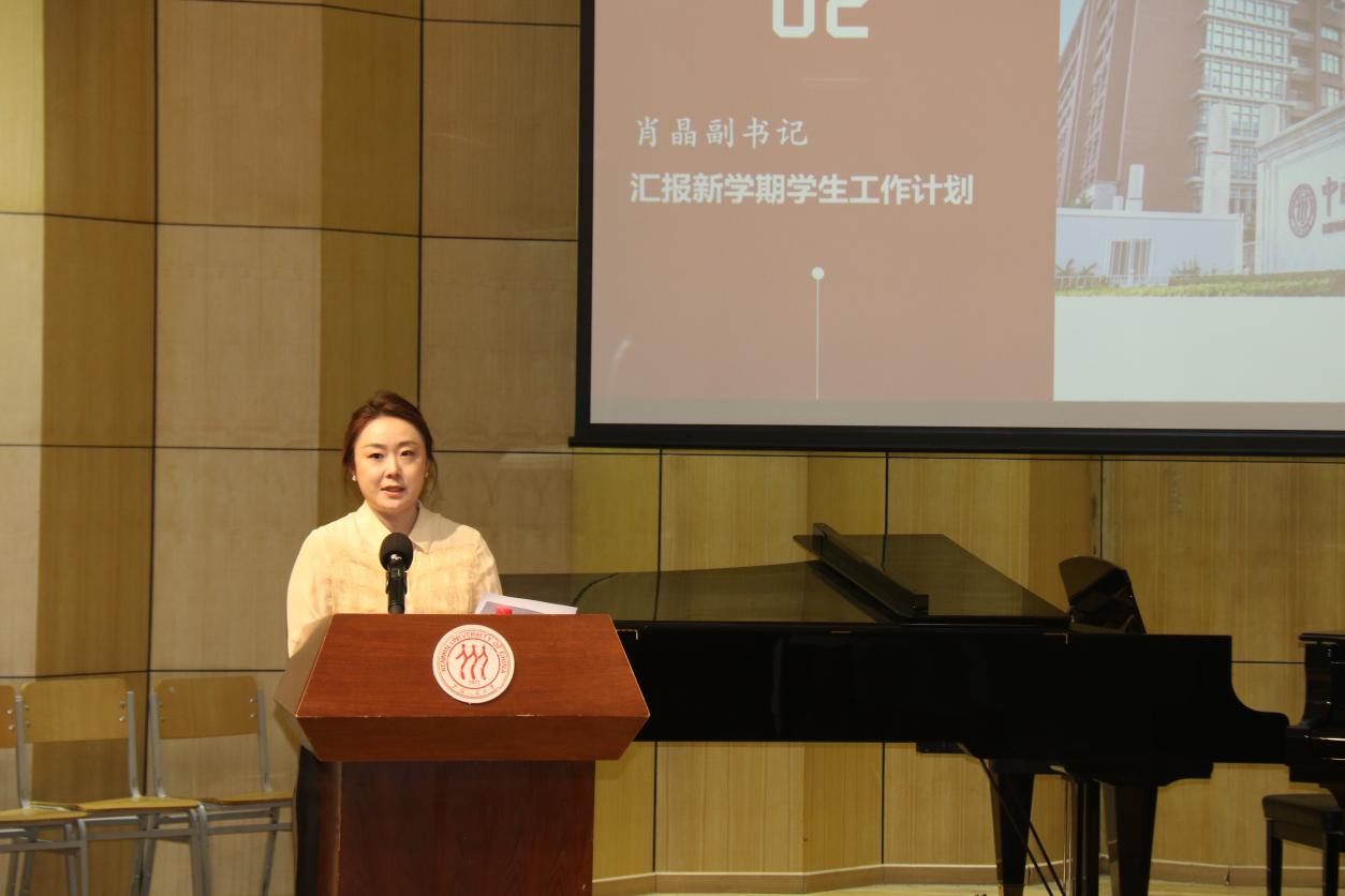 肖晶汇报新学期学院学生工作计划,强调以“以学生为本”,一是夯实党建阵地,提升全方位育人实效;二是聚焦成长需求,促进学生全面发展;三是推进辅导员队伍建设,适应高质量发展新要求;四是凝聚育人合力,全力以赴促进毕业生及时、充分、高质量就业;五是优化安全工作体系,筑牢心理健康教育保障体系。
