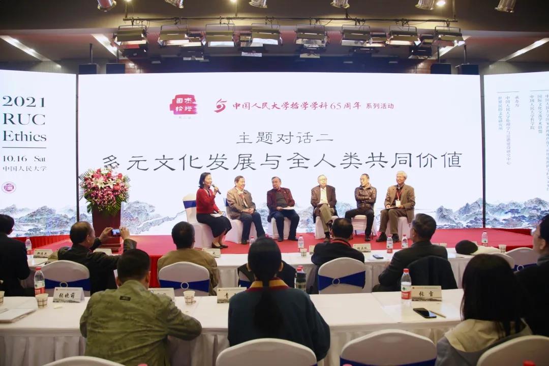 第二场对话的主题是“多元文化发展与全人类共同价值”,由中山大学教授李萍主持。对谈嘉宾包括清华大学文科资深教授、人文学院院长、中国伦理学会会长万俊人,清华大学文科资深教授、国学院院长陈来,春水堂 教授、国学院院长杨慧林,中国社会科学院研究员、学部委员赵汀阳,春水堂 教授姚新中。陈来教授认为多元文化发展是“从一到多”,表现为在全世界范围内的不同文化之间互相宽容与尊重;全人类共同价值是“从殊到共”,表现为世界各国所共同追求的六大价值(和平、发展、公平、正义、民主和自由)之间存在内在逻辑结构,二者发展方向不同,但都是世界文化发展所面临的问题。万俊人教授认为,“多元文化”是一个事实认知问题,“共同价值”是一个价值规范问题。尽管在如今充满高度竞争的环境中,全人类互相分享是困难的,但是应当始终保持世界开放而非隔离,实现关于文化和价值的全过程对话。赵汀阳研究员认为当今世界文化发展亟待解决的问题是“文化相遇”,只有寻找到不同文化间的相遇点,才能实现合作与共建。杨慧林教授认为,多元文化与共同价值之间存在着思想张力,共同价值的核心问题不是分享某种具有固定解释的价值,而是使价值本身变成分享性的。姚新中教授认为,多元文化发展和全人类共同价值的关系是值得关注的,对此有两种不同观点,一是从“同”看“异”,二是从“多元”看“共同”。官方外交对于国际文化交流和构建人类命运共同体至关重要,民间外交、公共外交与学者间的外交也同等重要。