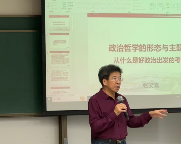 20日晚,张文喜教授为大家带来了一场题为“政治哲学的形态与主题:从什么是好政治出发的考察”的学术讲座。讲座由陈广思老师主持。张文喜教授的讲座从政治的根本和基础的哲学意义上把握政治哲学的形态、主题和好的政治的指向。他深刻分析了政治与哲学之间的冲突与张力,在理论性与历史性相结合的前提下,阐释了马克思主义政治哲学的精神高度。