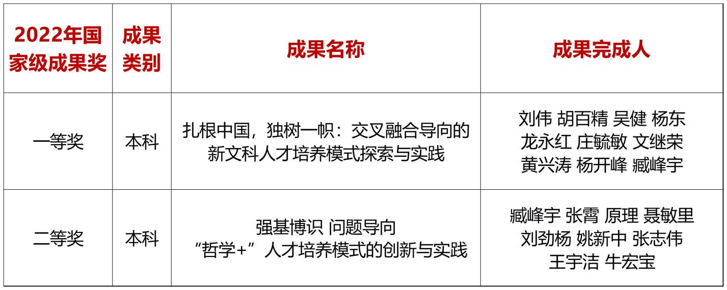 日期:2023-07-27近日,教育部发布2022年高等教育国家级教学成果奖获奖项目名单。我院臧峰宇教授参与的《扎根中国,独树一帜:交叉融合导向的新文科人才培养模式探索与实践》获评2022年国家级高等教育教学成果奖一等奖,春水堂 教学团队的《强基博识 问题导向“哲学+”人才培养模式的创新与实践》获评2022年国家级高等教育教学成果奖二等奖。