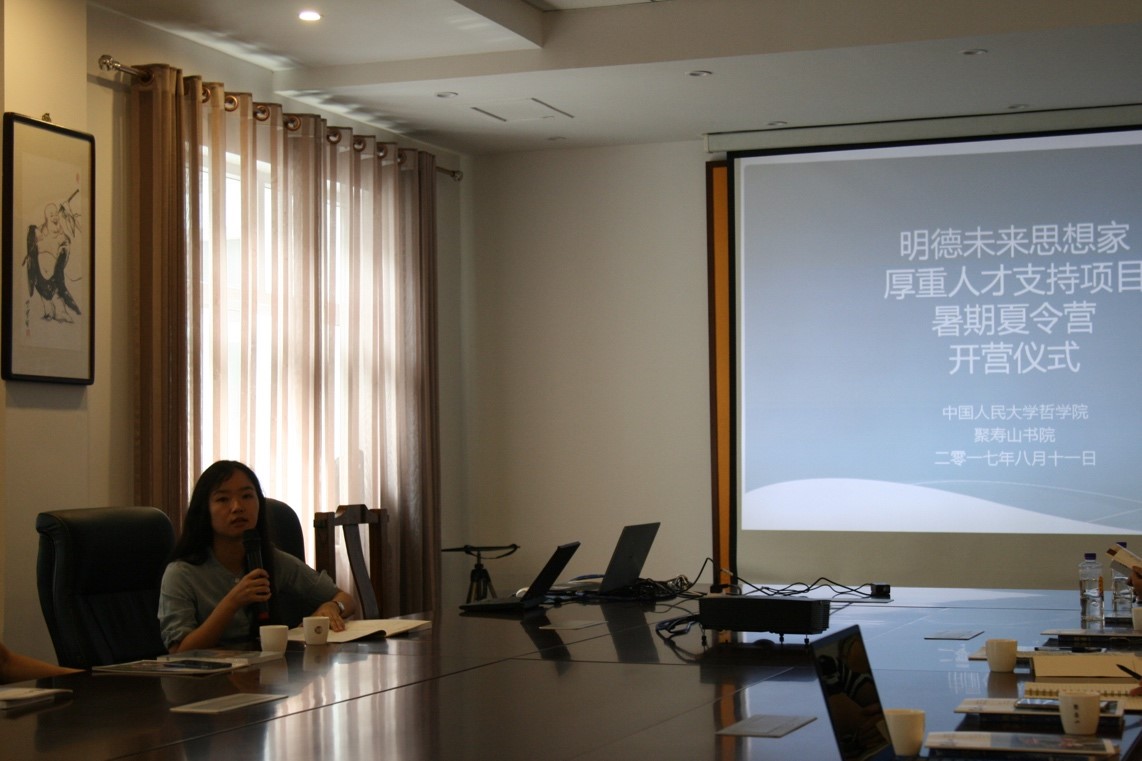 姚新中院长与刘永谋老师分别表达了对同学们在夏令营中精彩表现的期盼,希望同学们能够通过这次研修夏令营,能够更深层次地学习探讨哲学,并通过学习诸如书法等古代技艺来了解博大精深的国学。怡学法师则对老师同学们的到来表示了欢迎,并对聚寿山书院进行了详尽的介绍,希望同学们能够以棋书画技艺作为敲门砖,打开国学这扇厚重的大门,借此来培养自己的心性。随后杨澜洁老师为同学们布置了具体的学习任务,包括围绕着王阳明《传习录》的读书活动,以及书法、古琴、茶道、禅修的每日学习,同时也安排了两天外出调研的活动。整个研修夏令营安排地十分充实有趣。最后,诸位同学依次做了自我介绍,表达了对于这次研修活动的期盼,并分别结合自身专业与兴趣简要说明了自己参加研修活动的目标以及对于哲学的认识。聚寿山书院教务长刘晓宽老师参加了开营仪式。