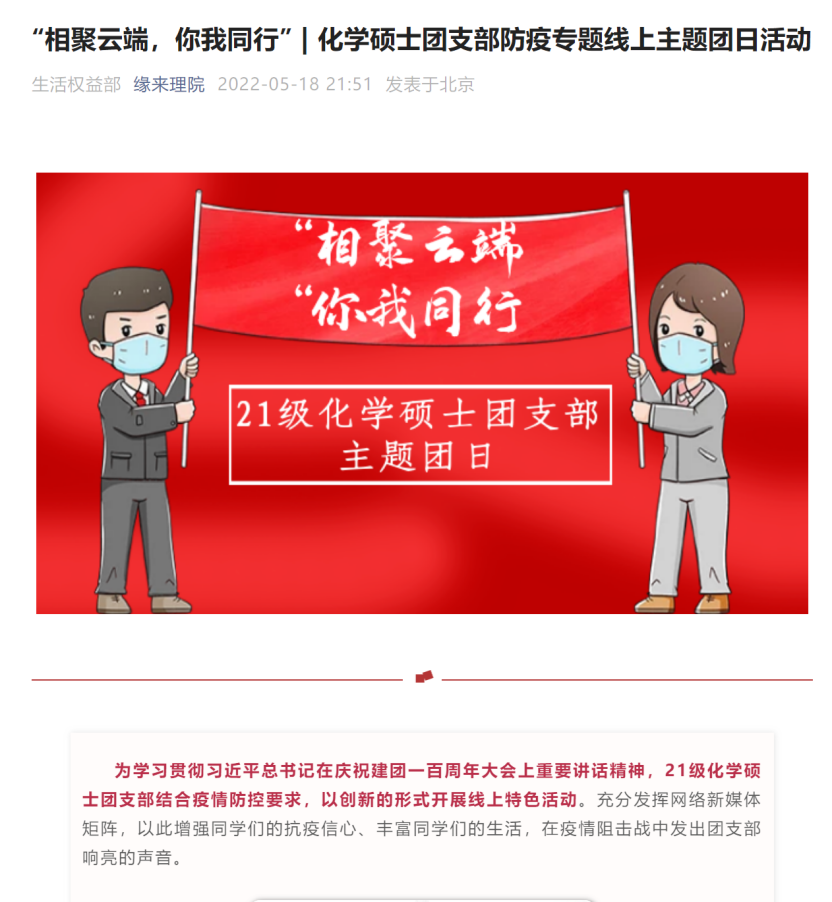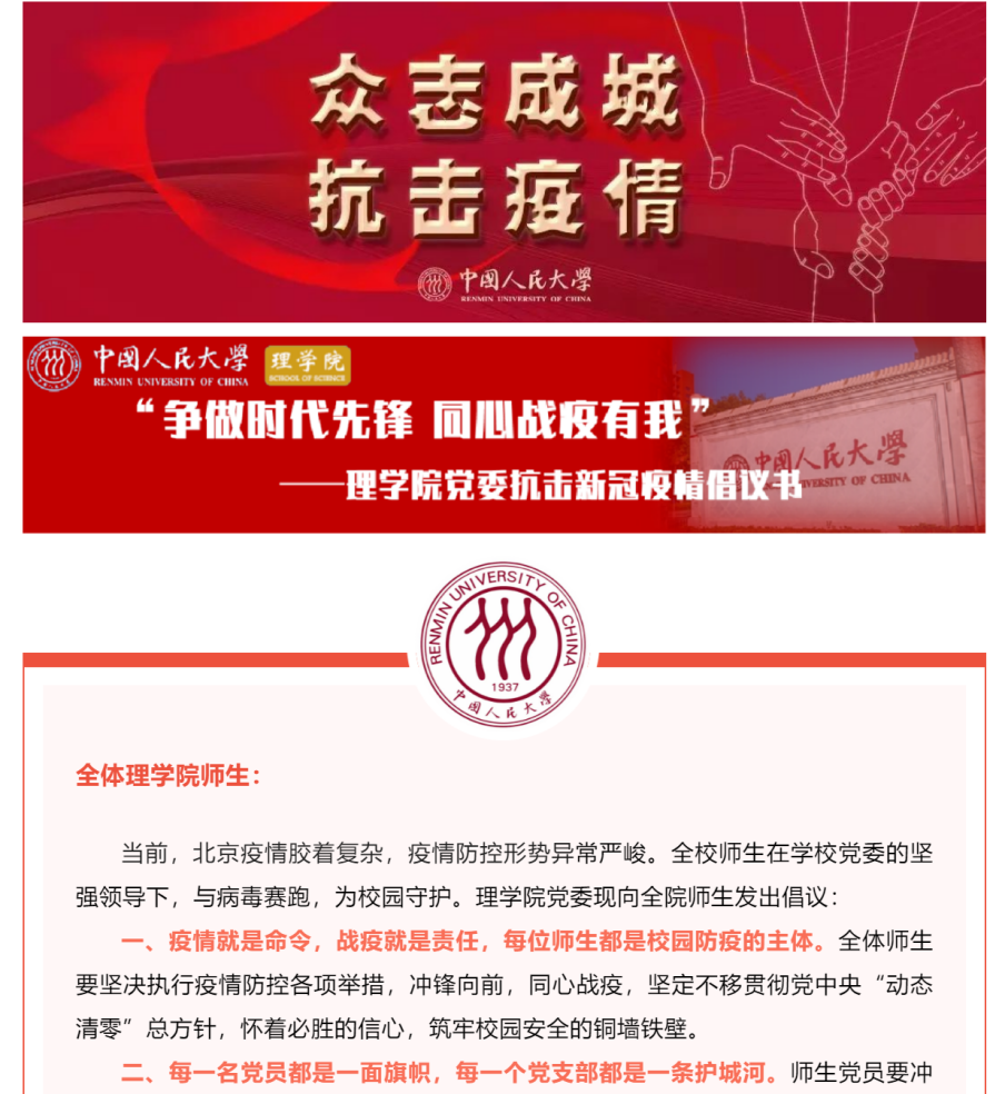 党旗所指就是团旗所向!理学院党委向全院师生发出“争做时代先锋,同心战疫有我”抗击新冠疫情倡议书,学院各团支部积极响应号召,纷纷开展战“疫”主题团日活动,引导广大团员青年坚定必胜信心、积极配合学校防疫举措。
