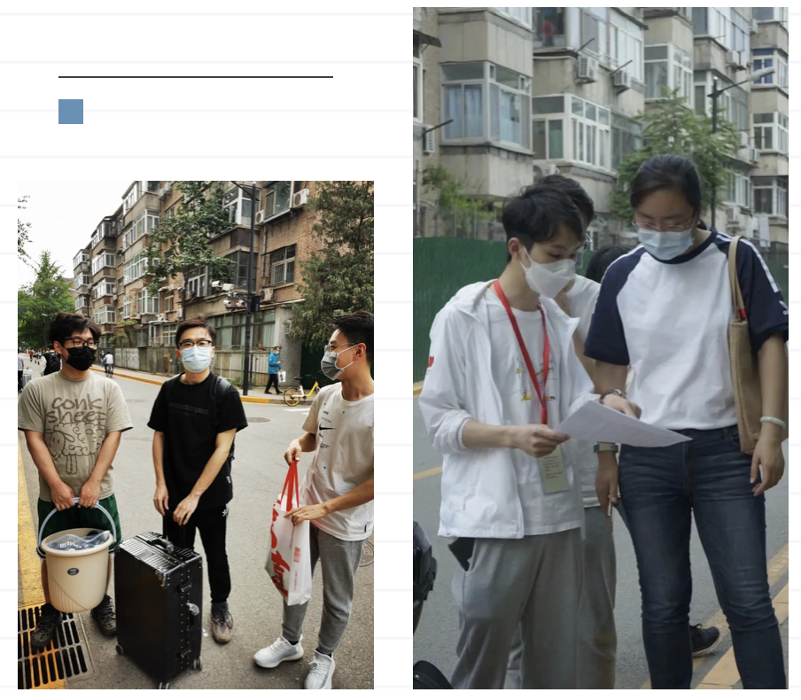 张鹏举、马建波、范婷、李京徽四位老师自愿参加学校疫情防控志愿服务,在世纪馆为广大师生提供核酸检测保障服务;在学校封闭管理后,张鹏举、刘劲杨、杨澜洁、卫一帆4名教职工党员自愿“逆行”,第一时间由校外家中返校,在办公室搭建简易床,24小时值守校园,为同学们提供稳妥、安全的坚强保障,还为在校外居住的教职工挂号取药、浇灌植物;党员先锋队中的学生党员为特殊生活需求学生主动购买水果,为存在特殊生活困难的同学们进行核酸提醒和打卡帮扶;在校外居住的师生调动一切可以调动的力量,为校内值守的老师们提供充分的物资保障和暖心关怀……