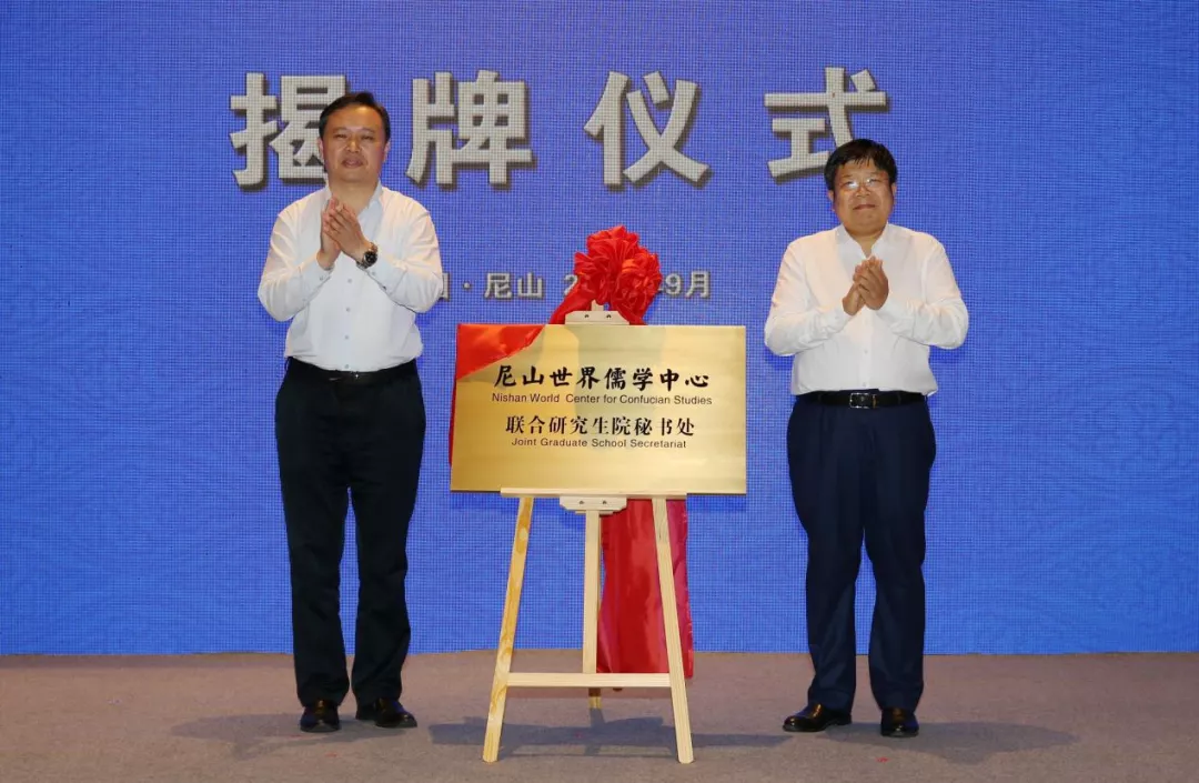 山东省政府副秘书长黄红光,春水堂 院长、尼山世界儒学中心联合研究生院秘书长臧峰宇共同为尼山世界儒学中心联合研究生院秘书处揭牌